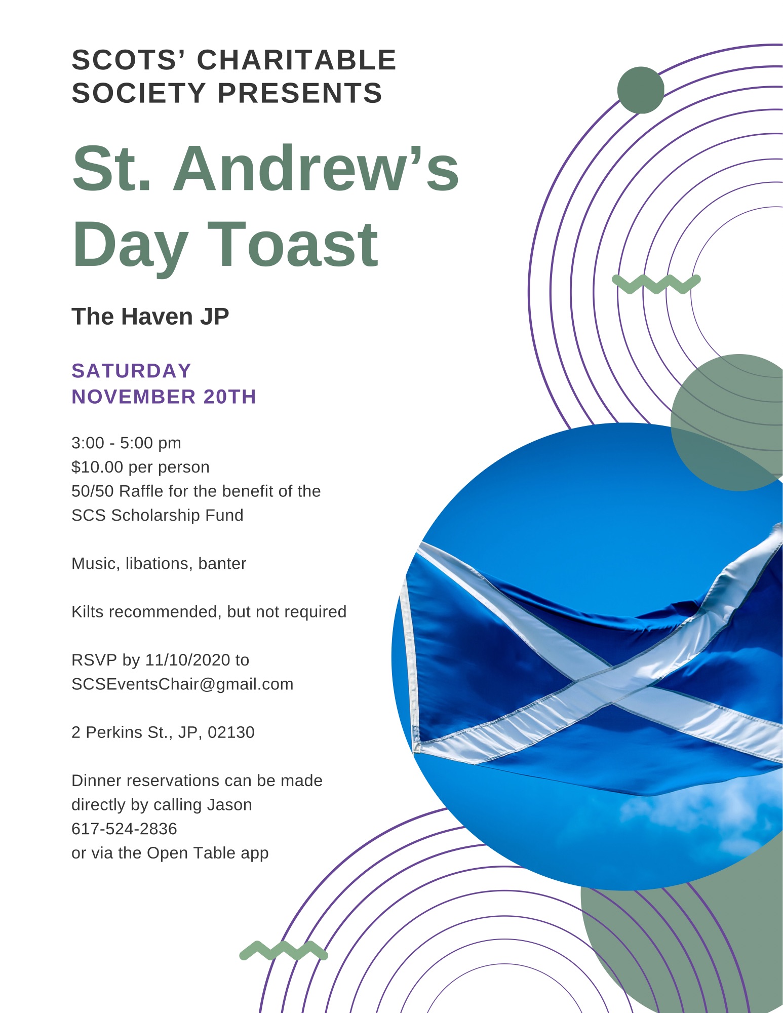 St. Andrew’s Day Toast November 5, 2021January 24, 2022 / Scots' Charitable Society Members! Join us on November 20th at The Haven for a Saint Andrew’s Day toast! RSVP by 11/10 to SCSEventsChair@scotscharitable Related