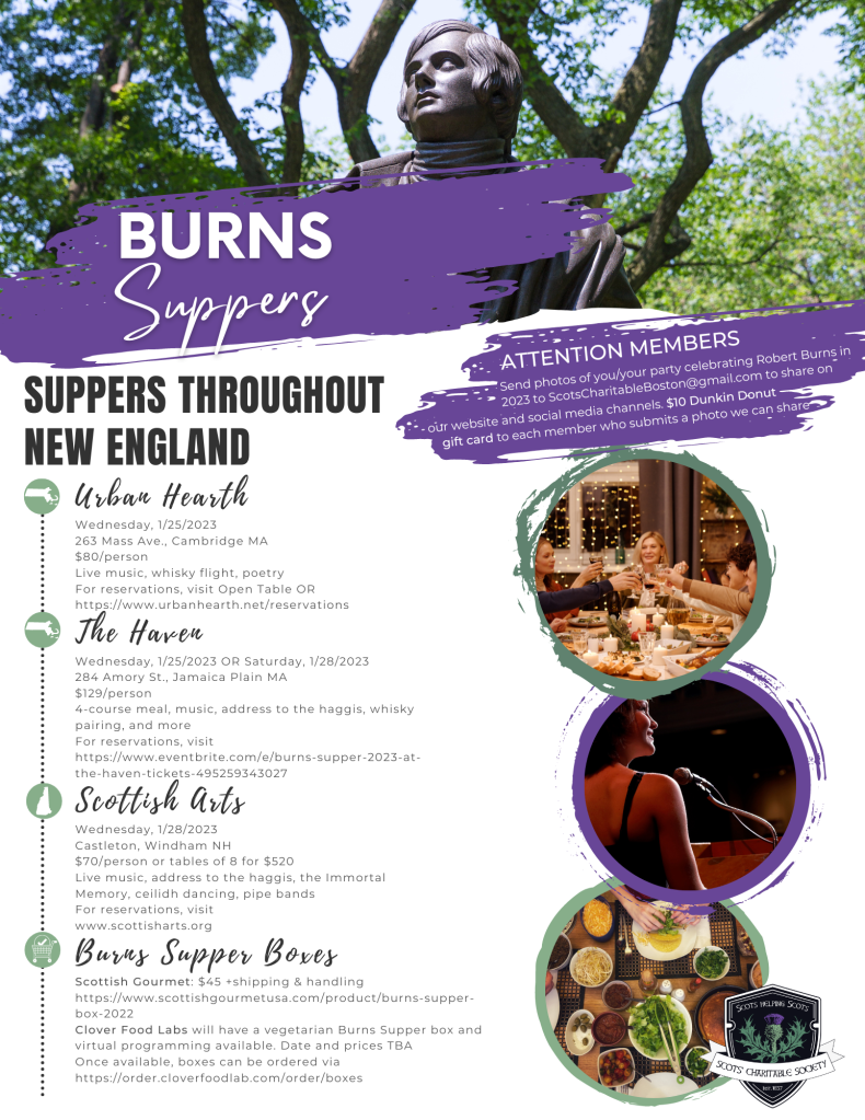 Are you an SCS member? Send photos of you/your party celebrating Robert Burns in 2023 to ScotsCharitableBoston@gmail.com to share on our website and social media channels. $10 Dunkin Donut gift card to each member who submits a photo we can share.