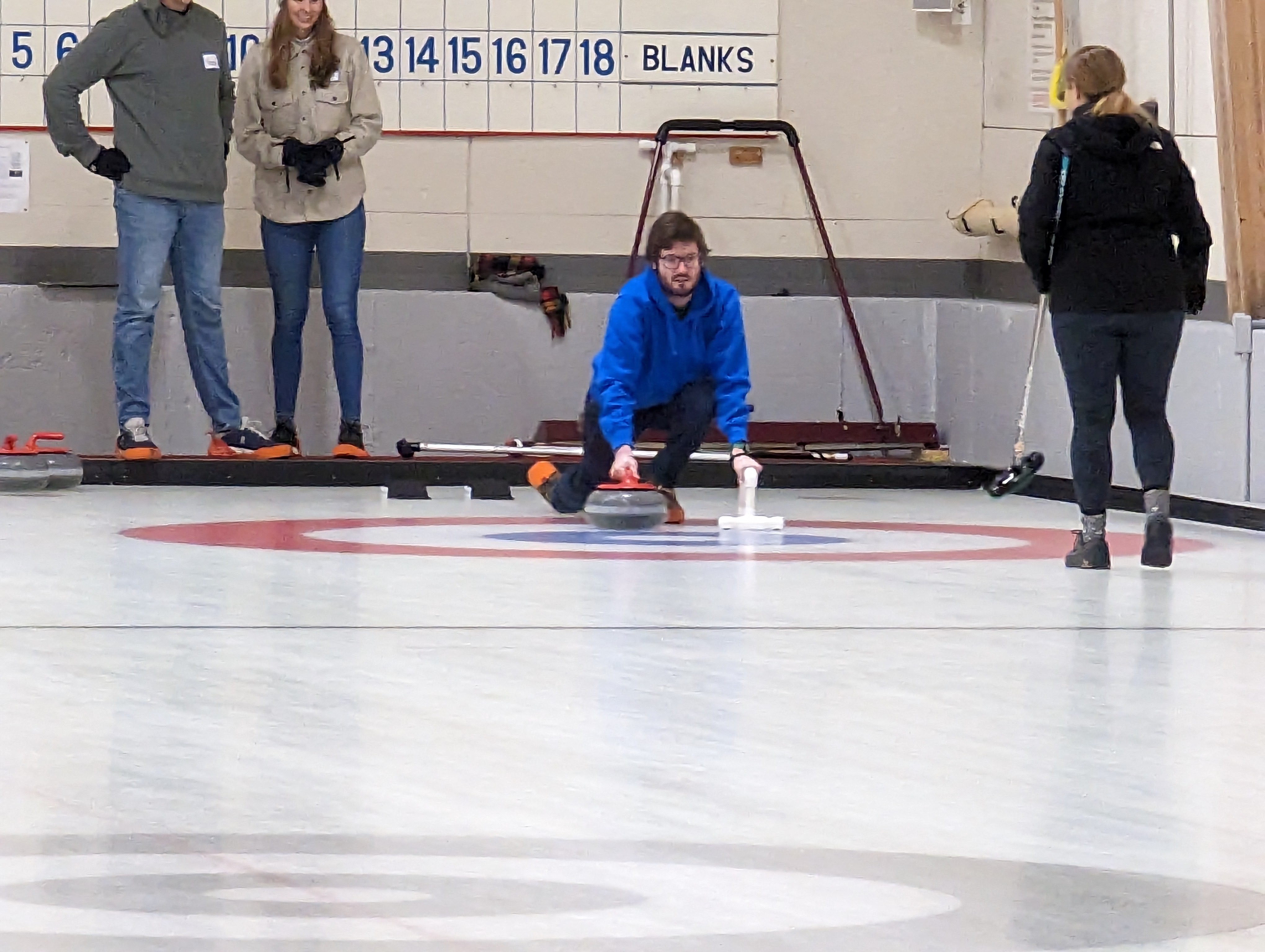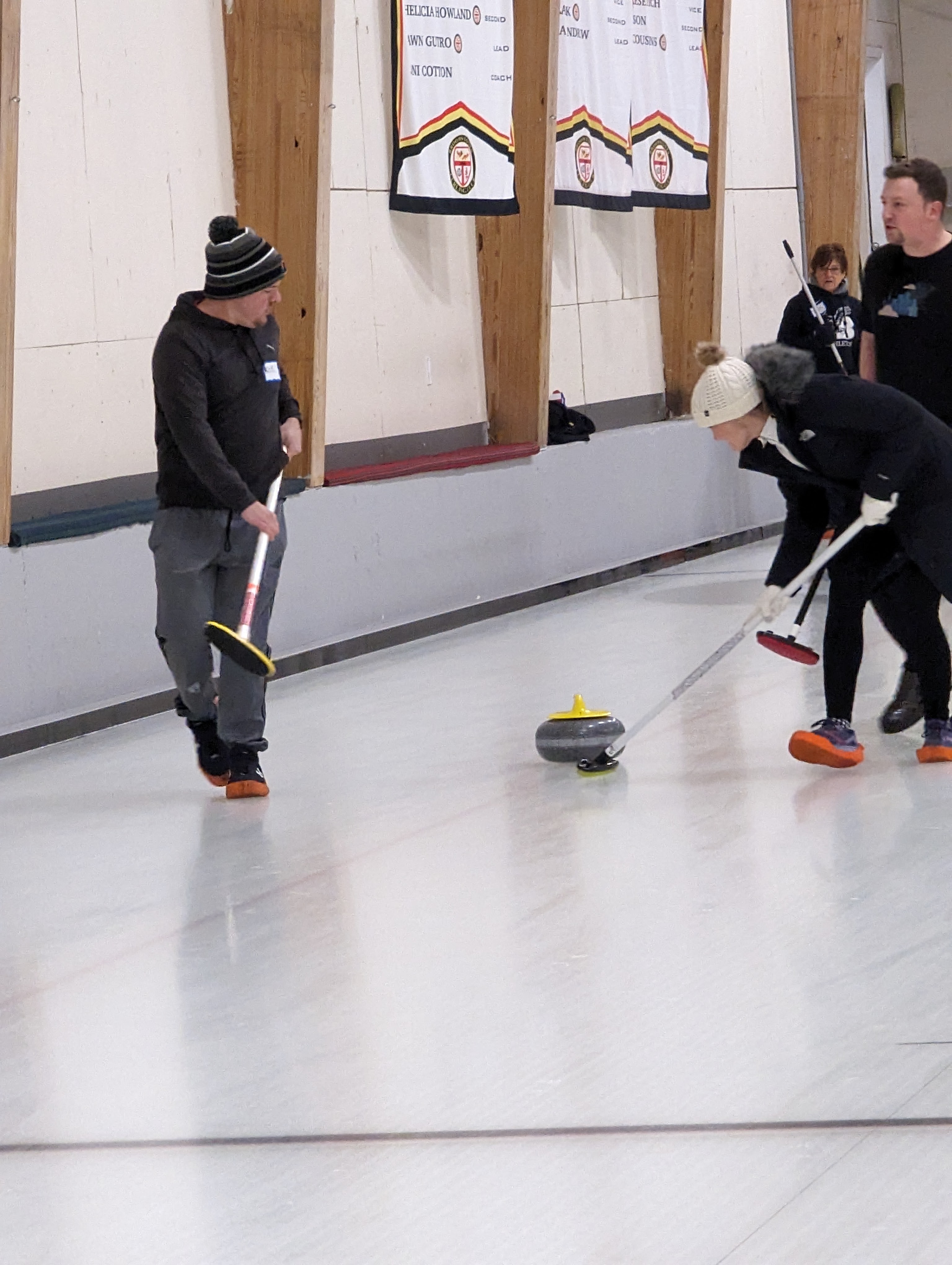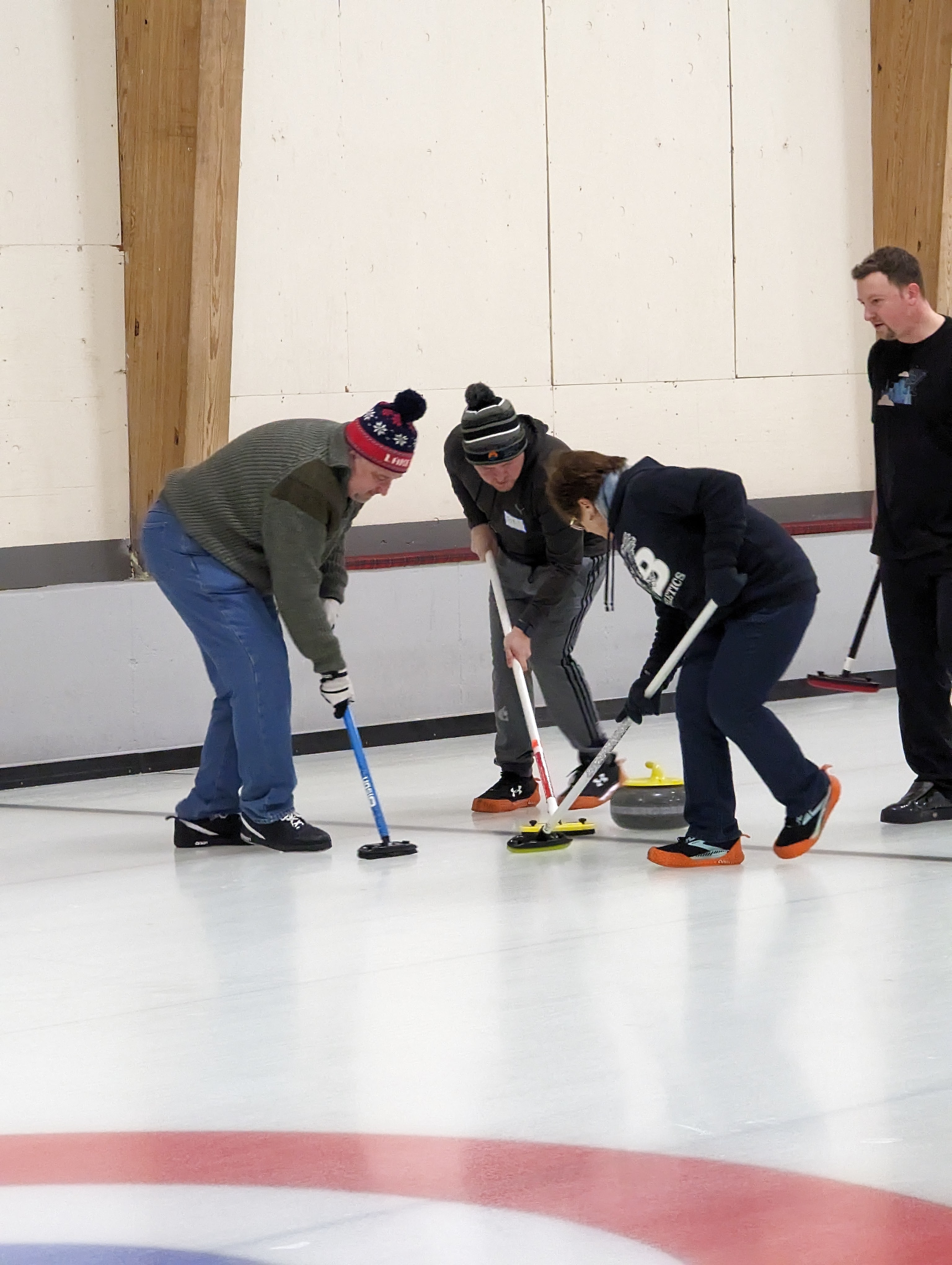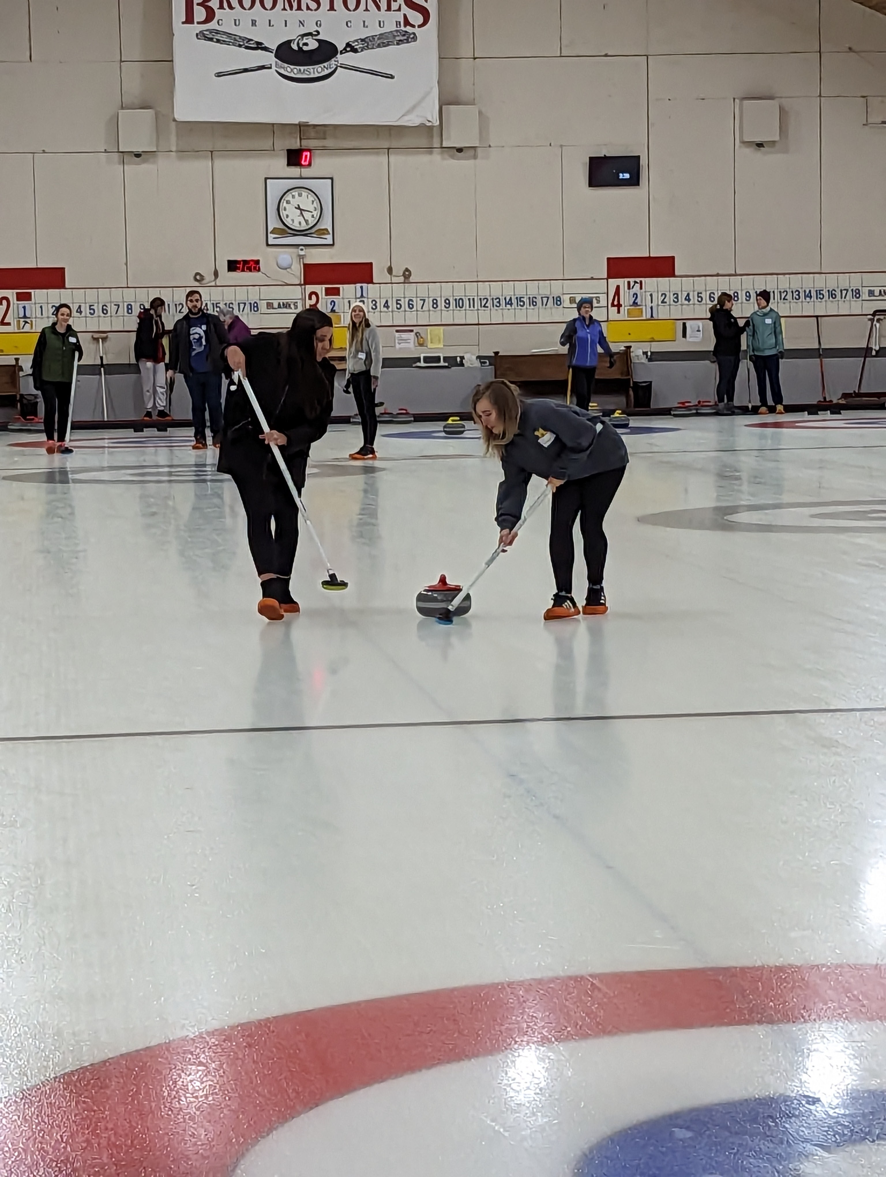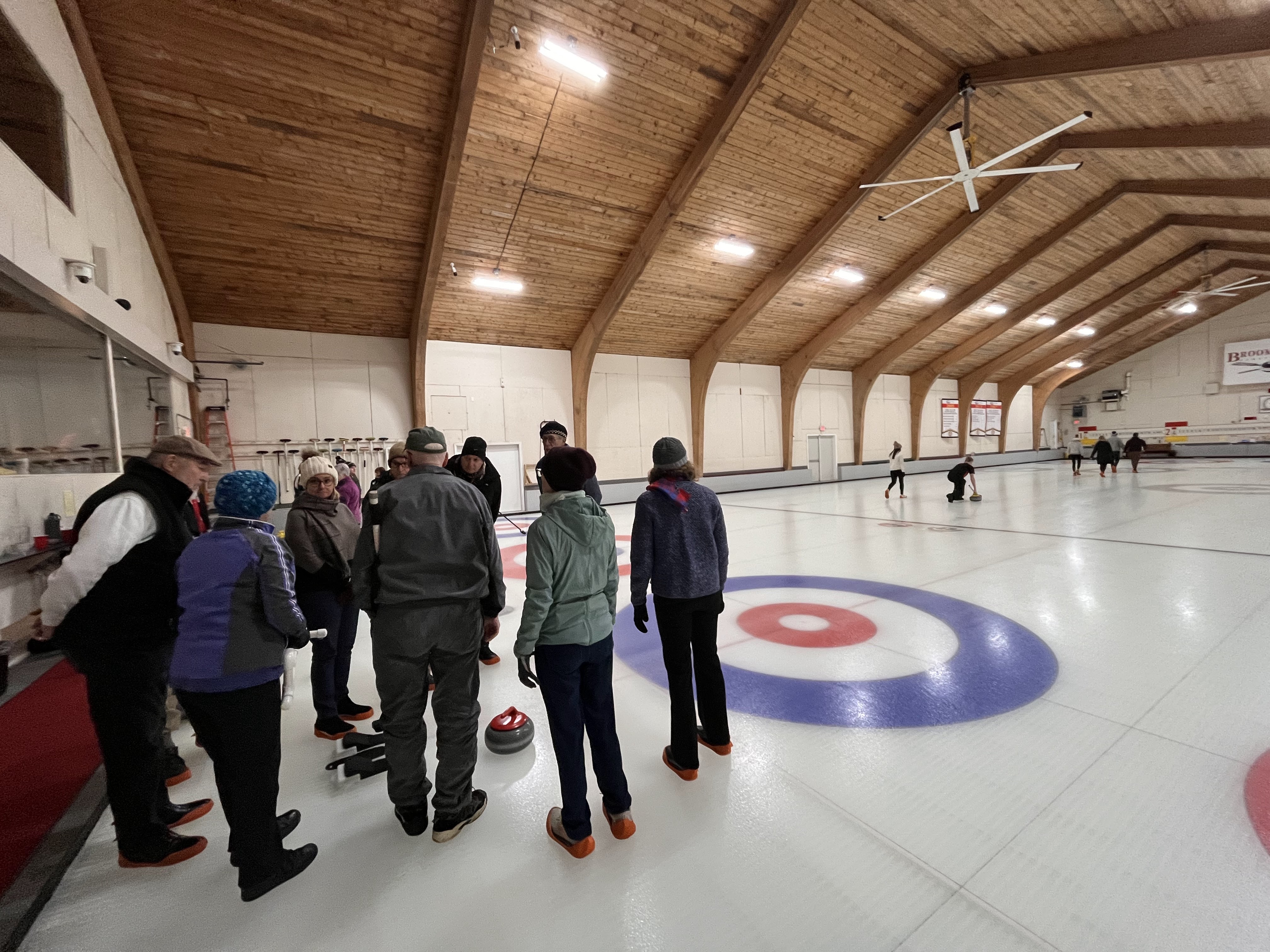 We started off with an informative safety briefing, then hit the ice to start learning the ropes of throwing, sweeping, and scoring. After a few practice rounds, each team played a brief game, then headed to the lounge for the traditional post-game drinks and banter. A great time was had by players and spectators alike. We look forward to hosting another curling event in the future! Good curling, everyone!