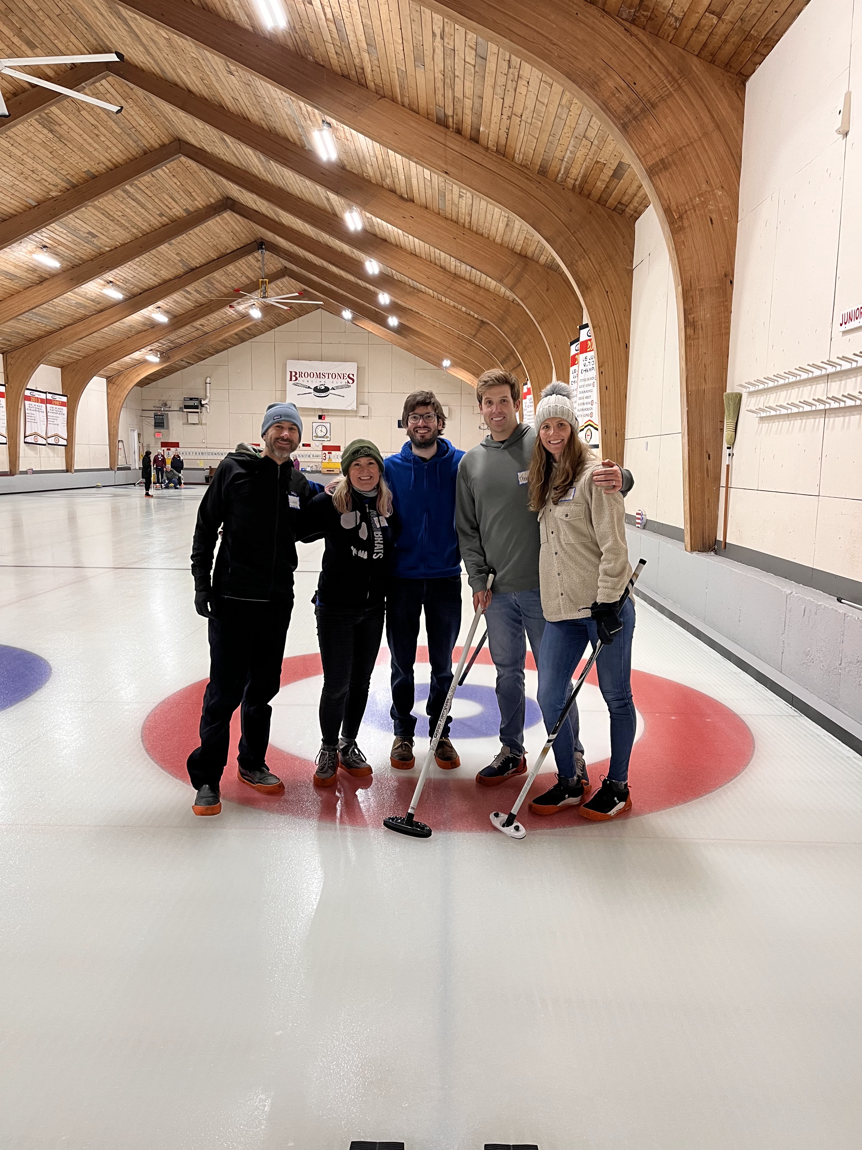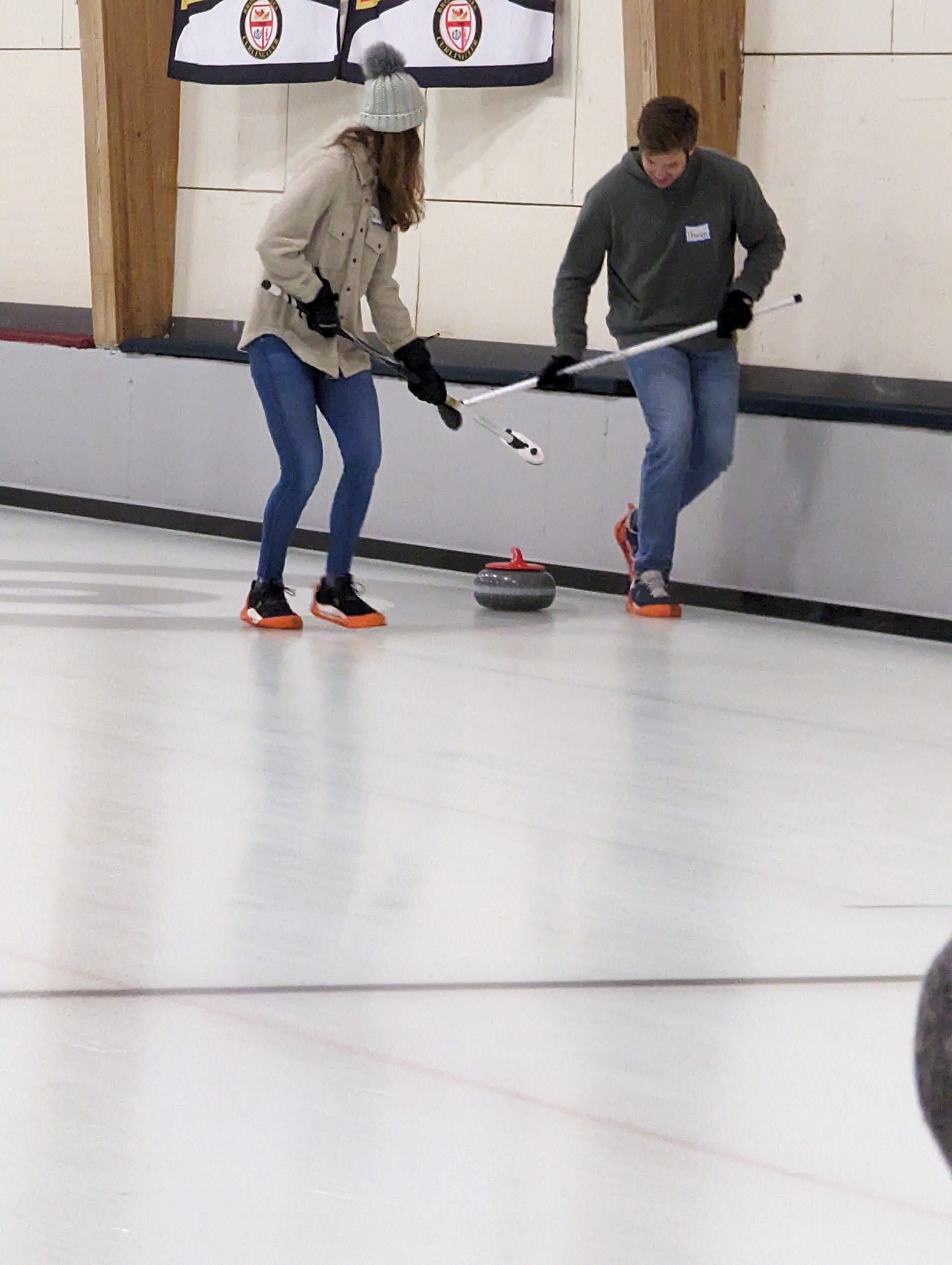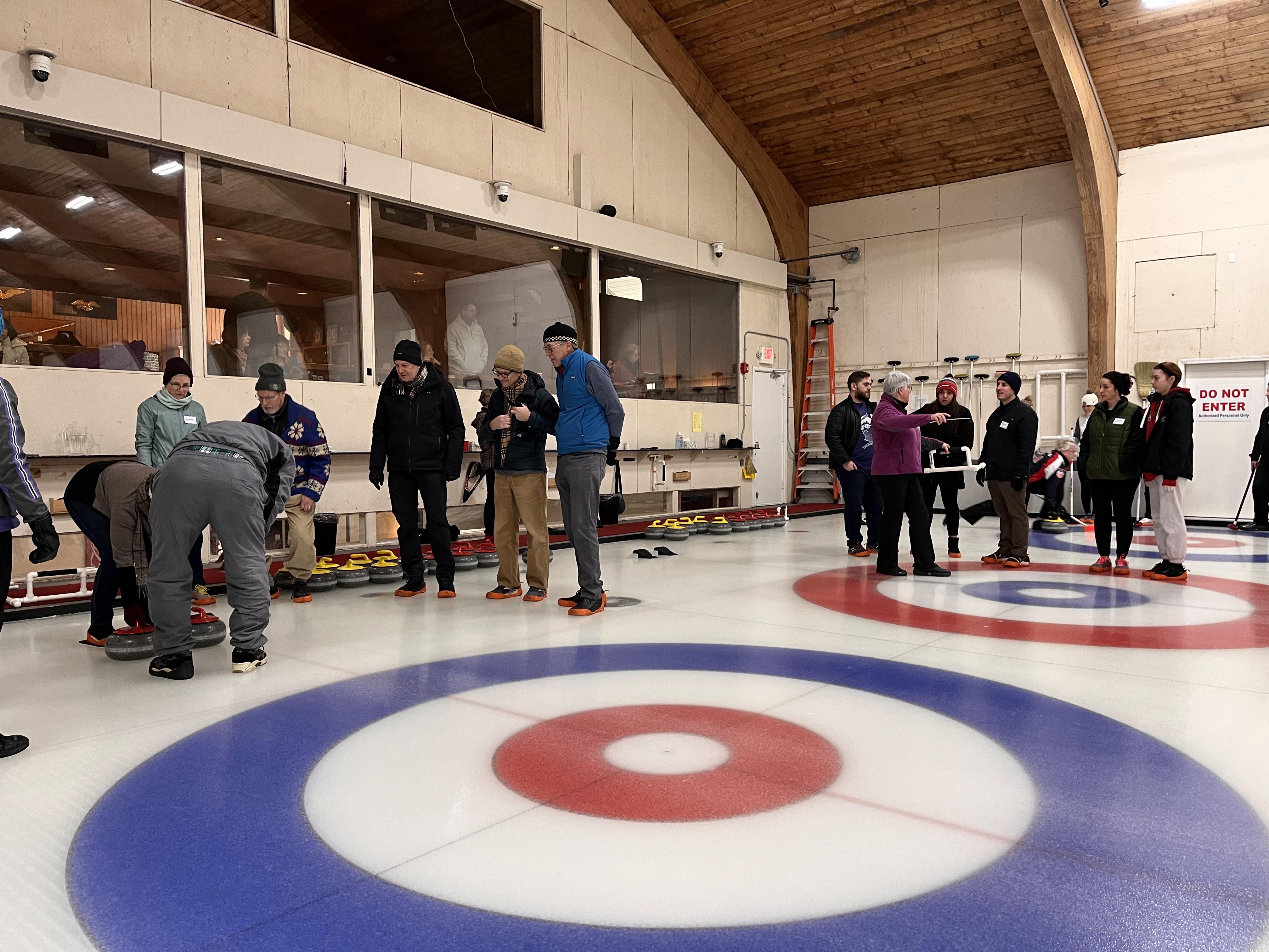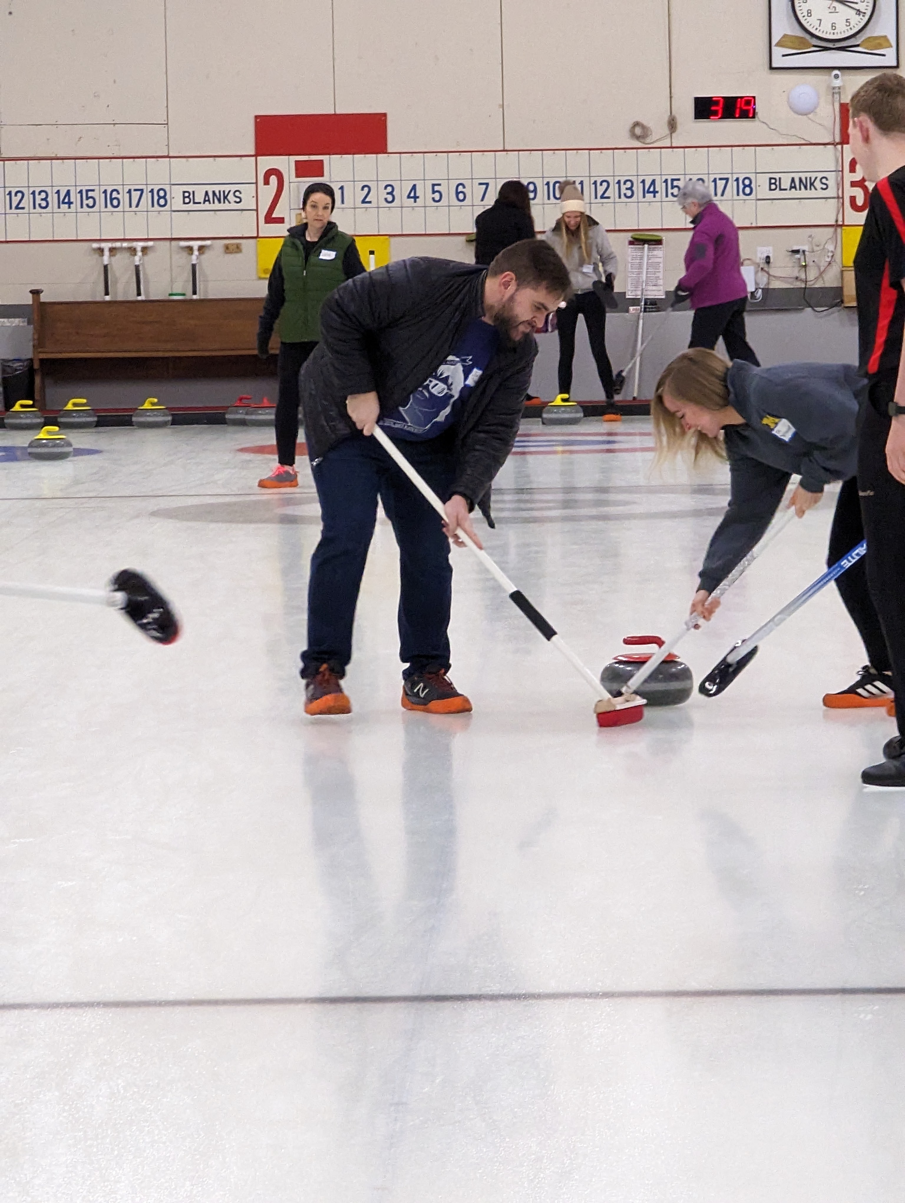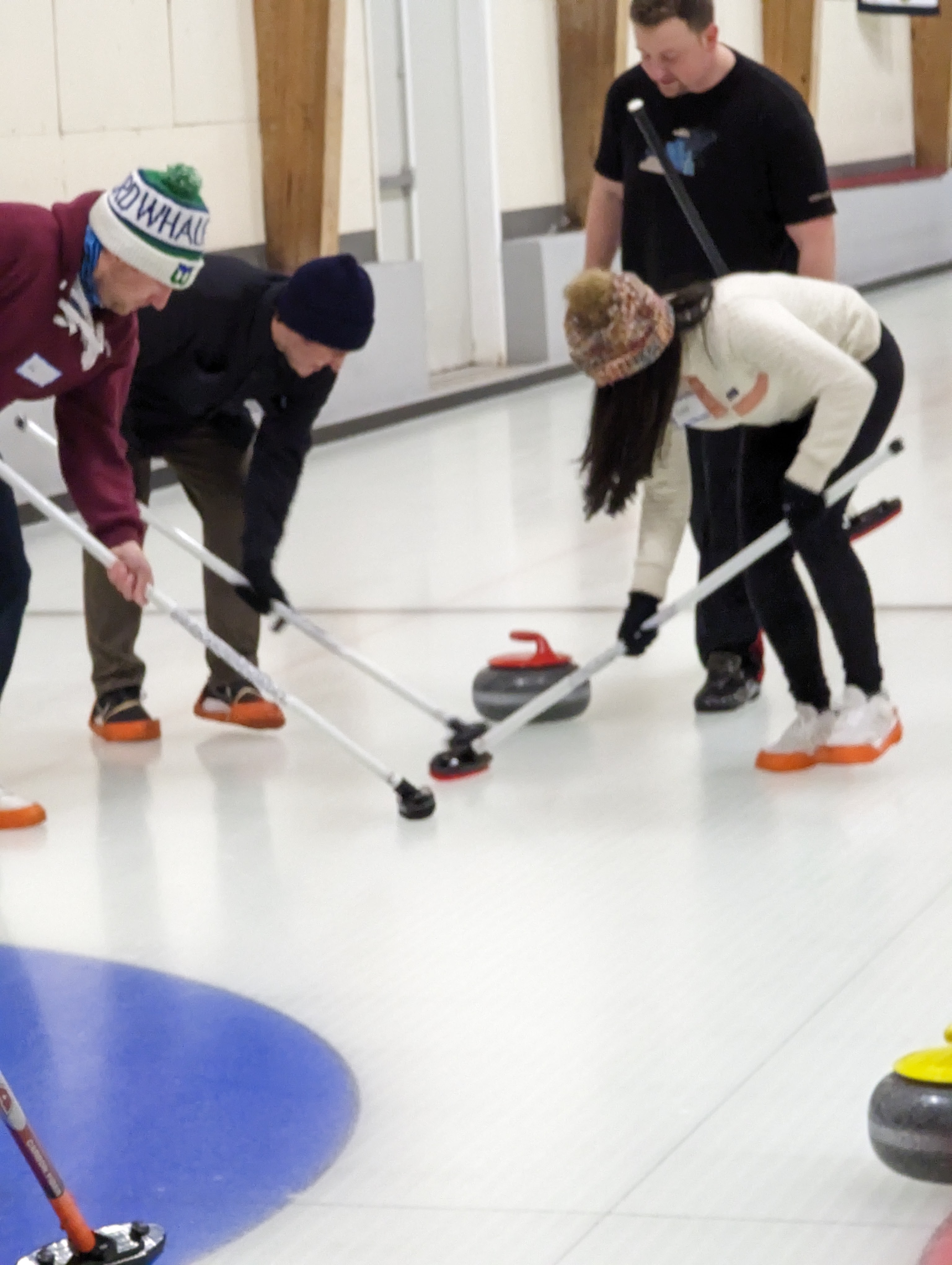 We started off with an informative safety briefing, then hit the ice to start learning the ropes of throwing, sweeping, and scoring. After a few practice rounds, each team played a brief game, then headed to the lounge for the traditional post-game drinks and banter. A great time was had by players and spectators alike. We look forward to hosting another curling event in the future! Good curling, everyone!