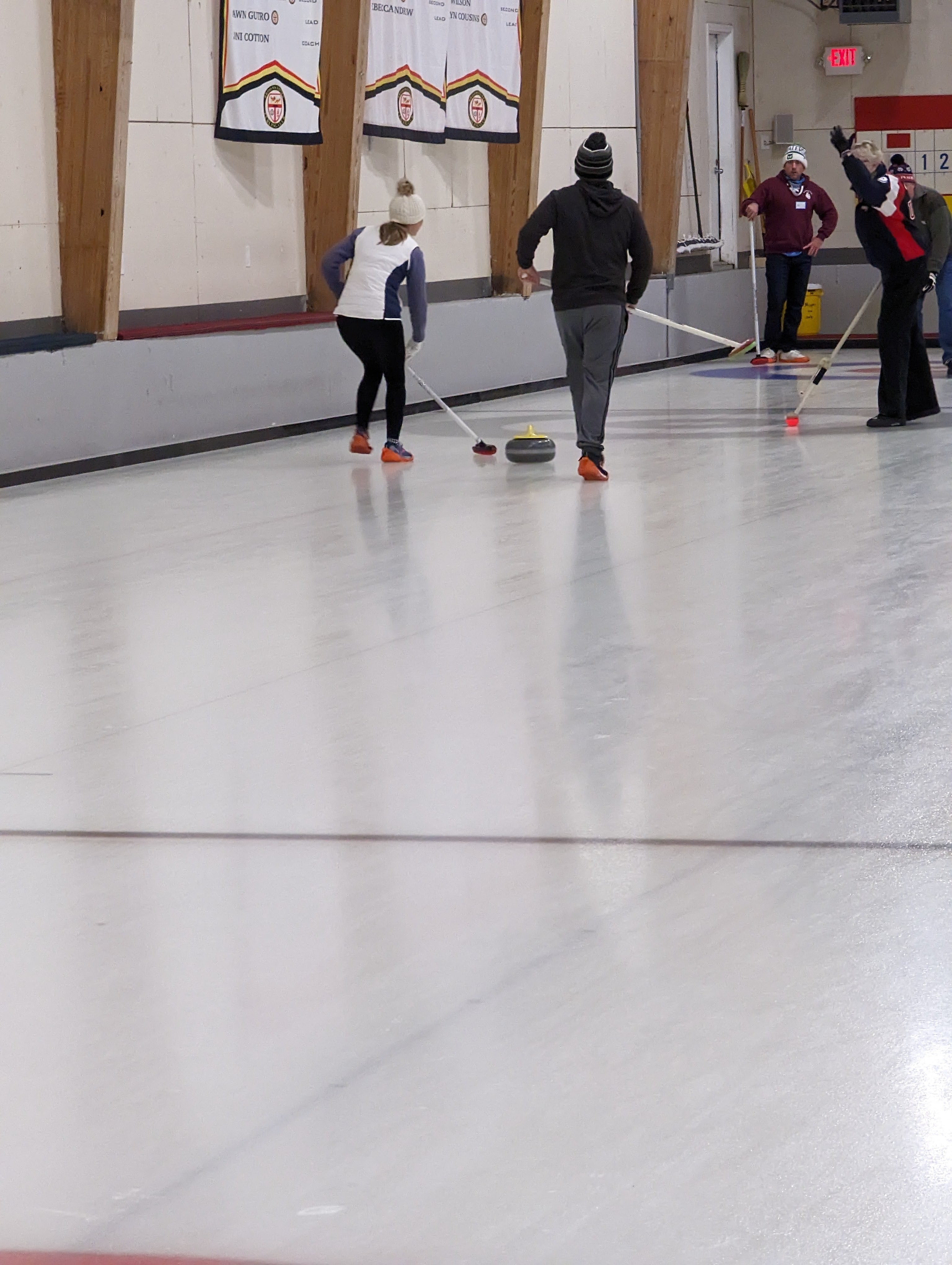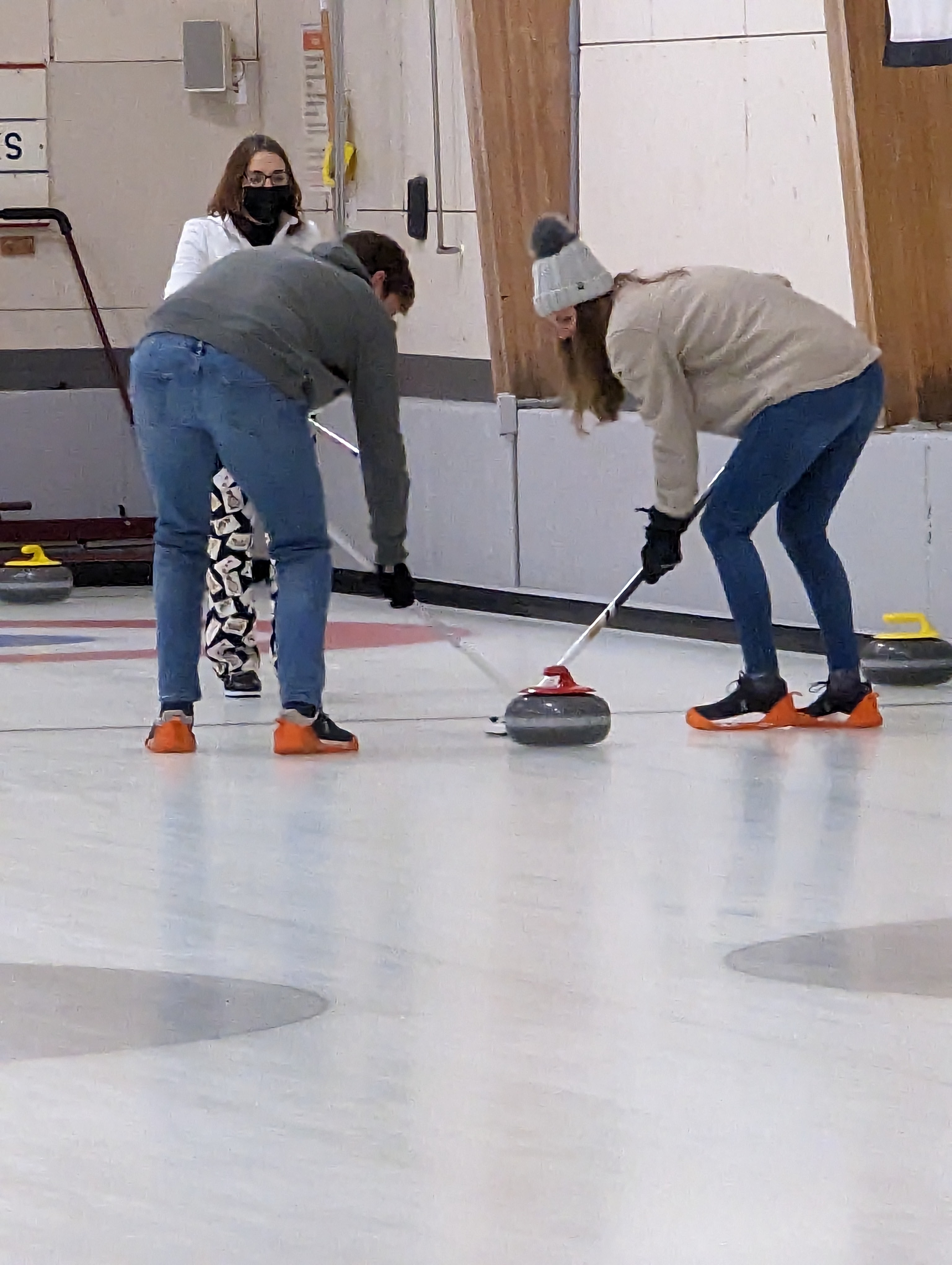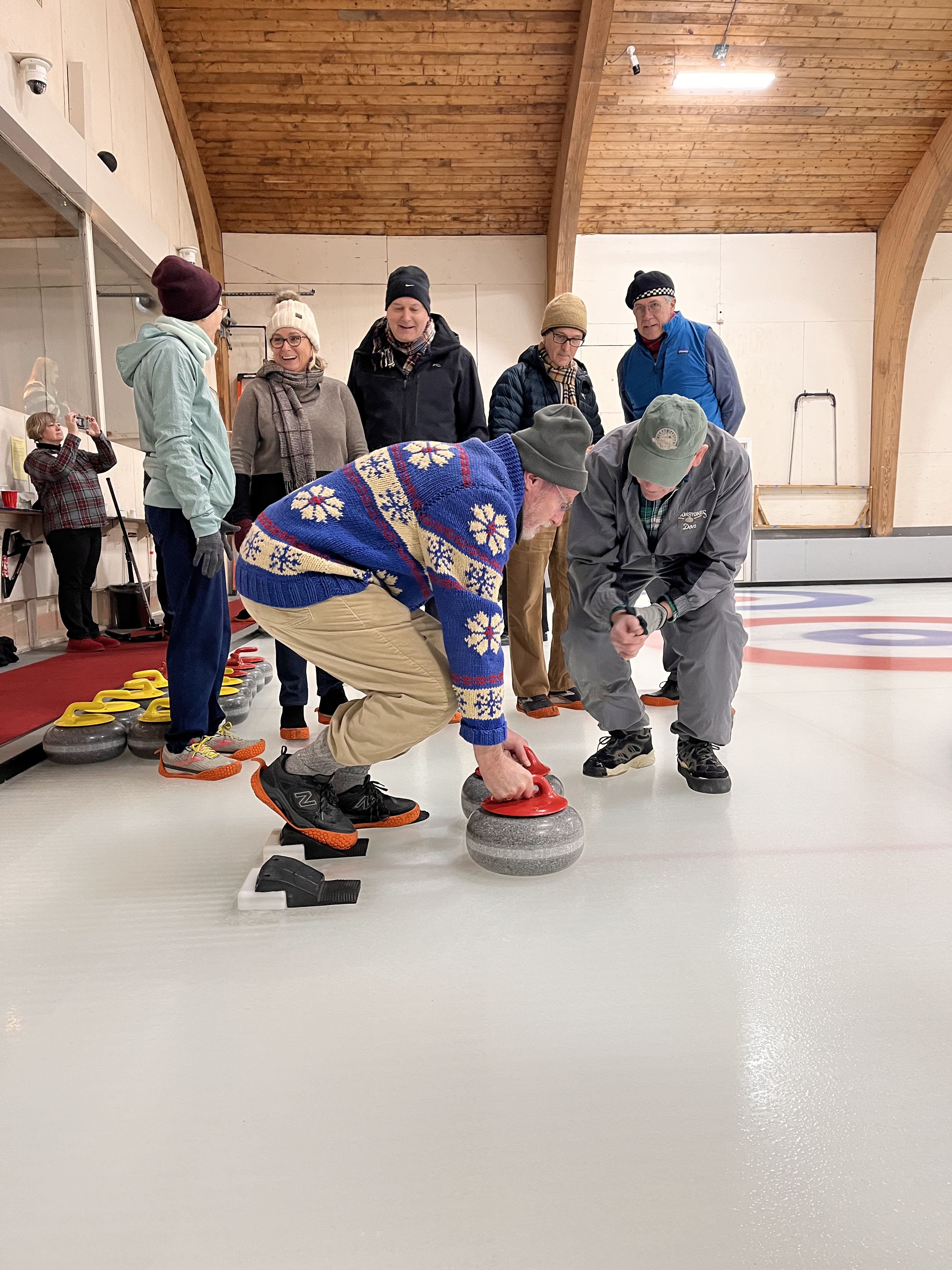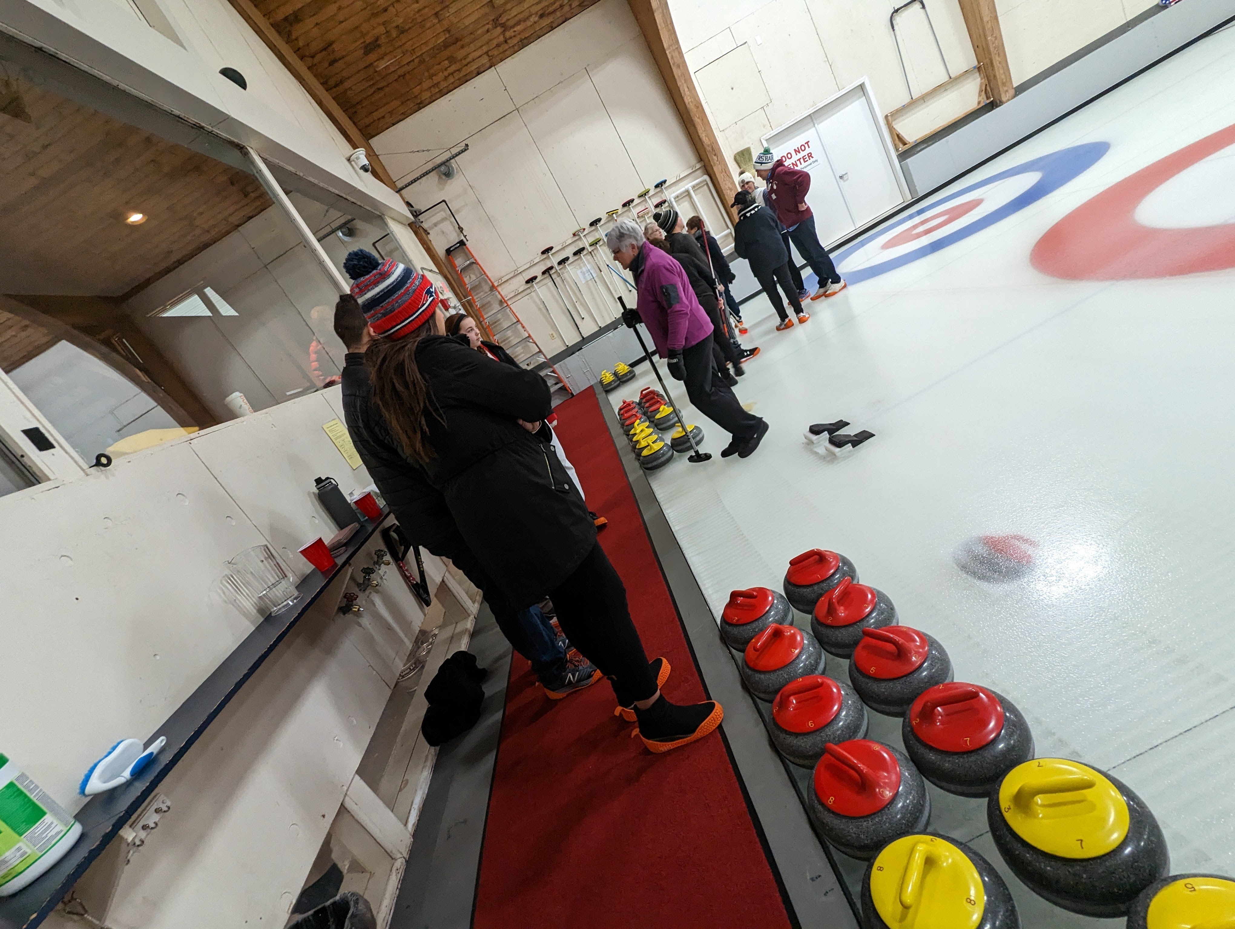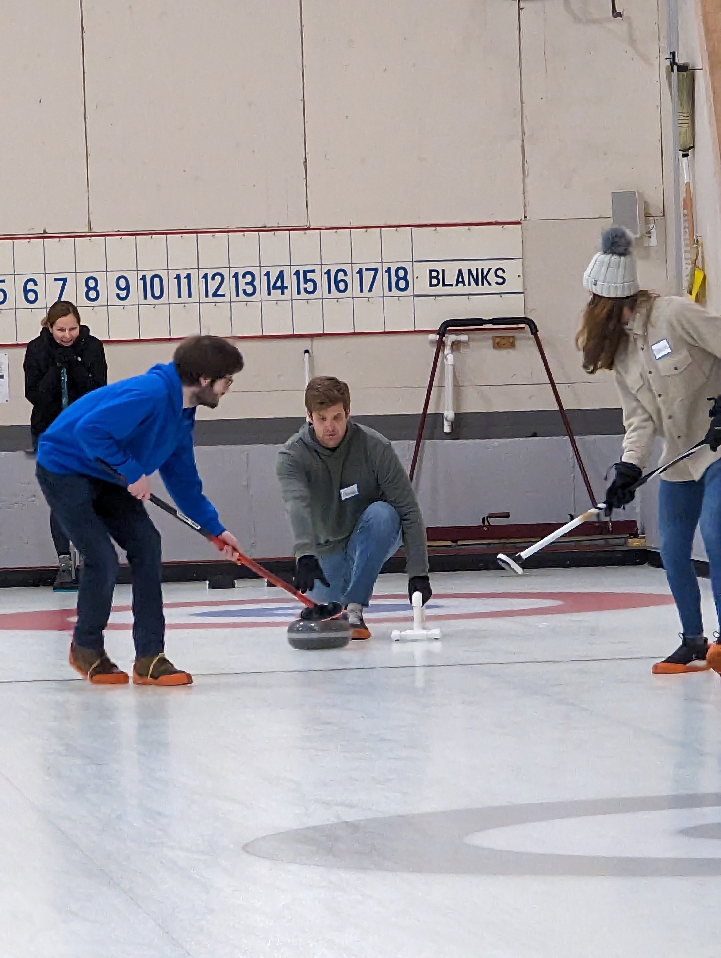 We started off with an informative safety briefing, then hit the ice to start learning the ropes of throwing, sweeping, and scoring. After a few practice rounds, each team played a brief game, then headed to the lounge for the traditional post-game drinks and banter. A great time was had by players and spectators alike. We look forward to hosting another curling event in the future! Good curling, everyone!
