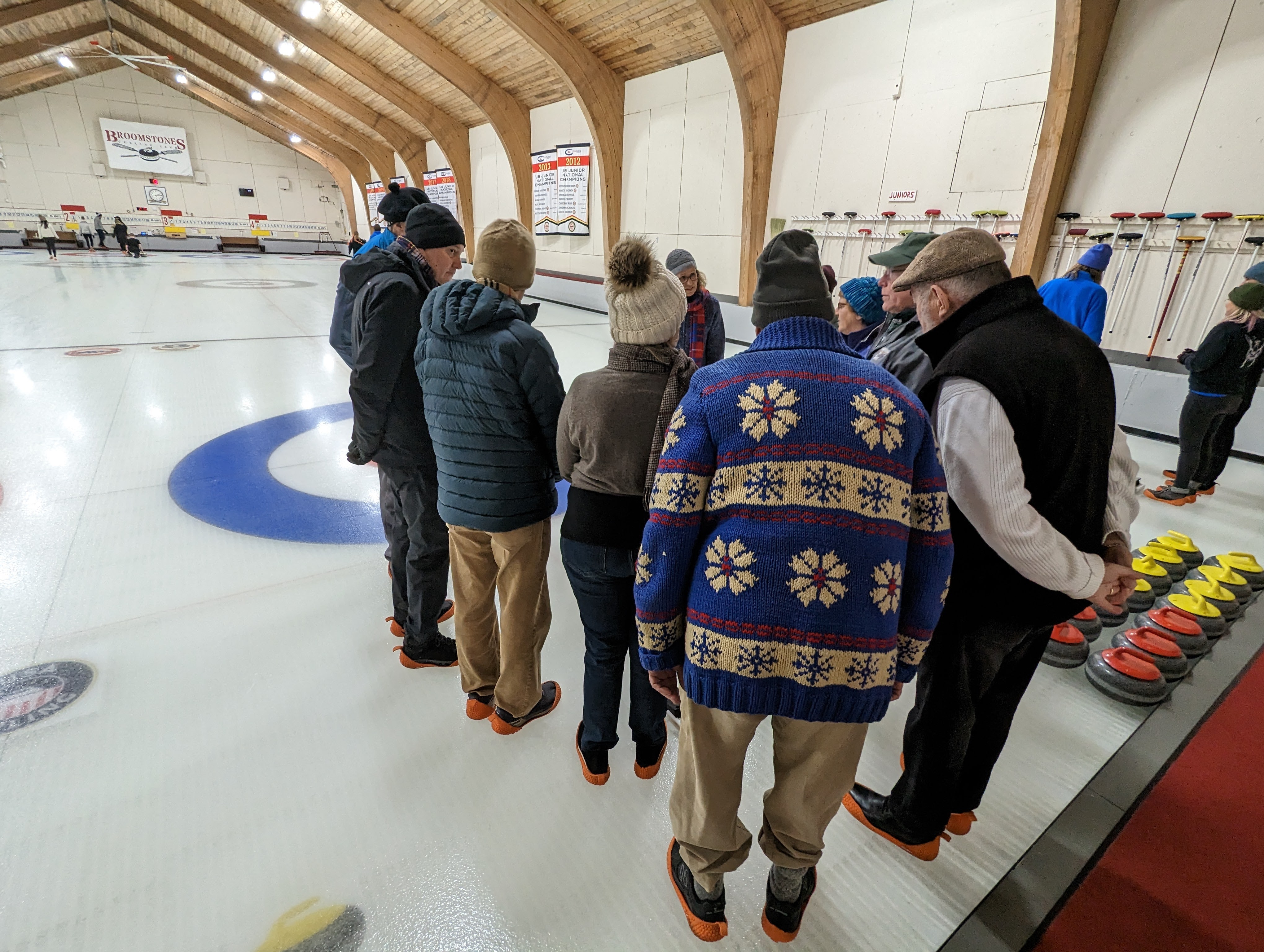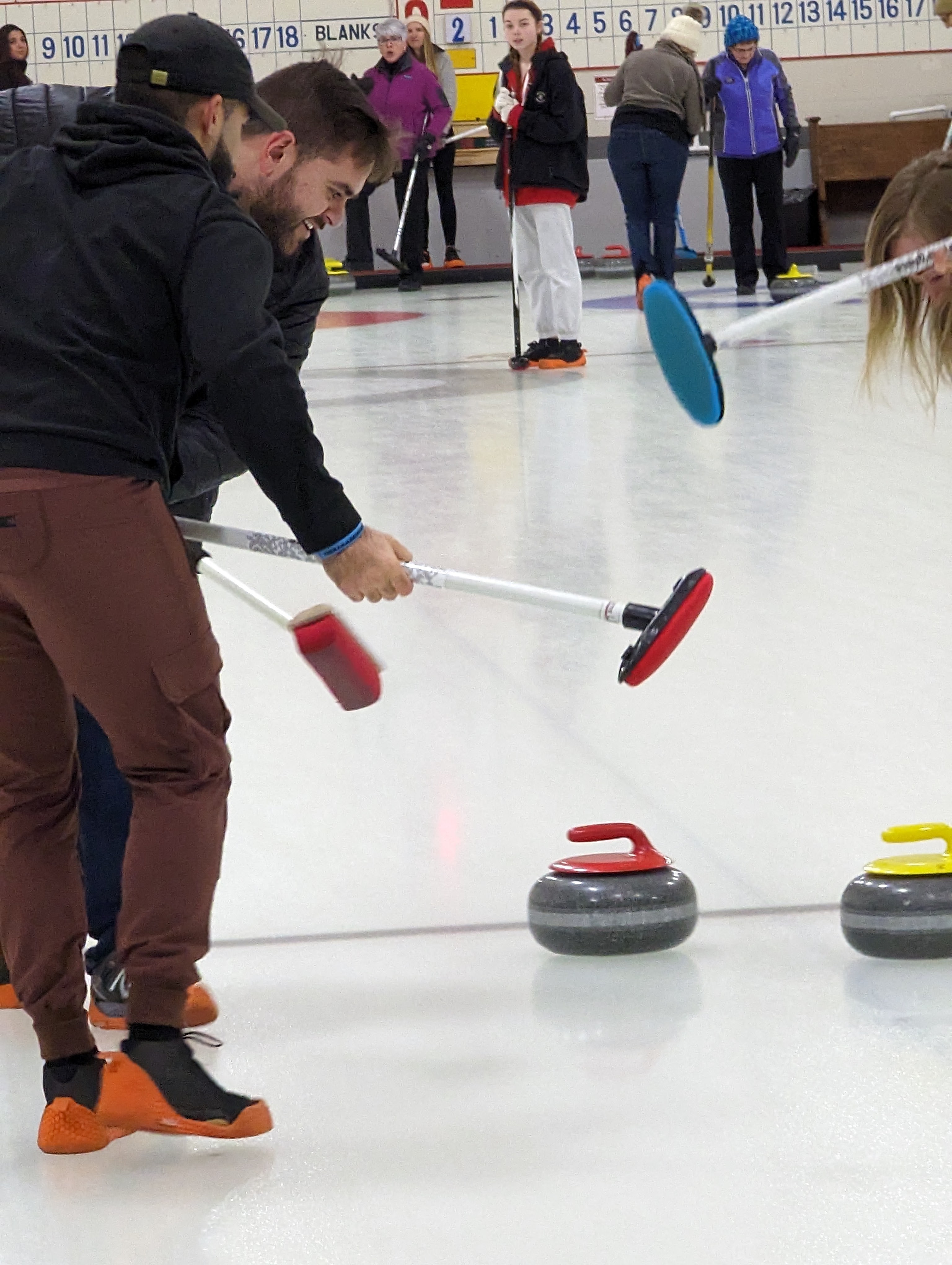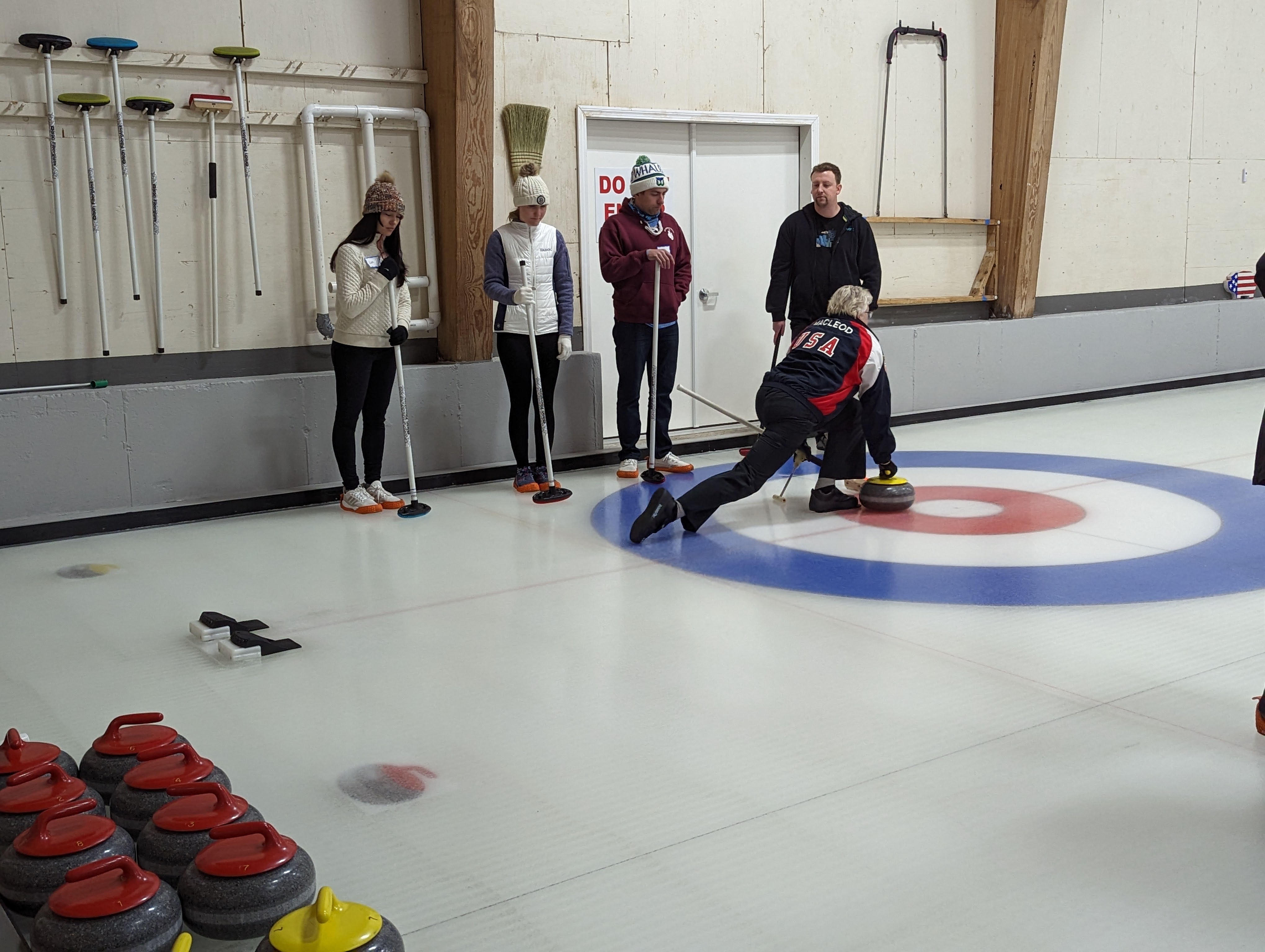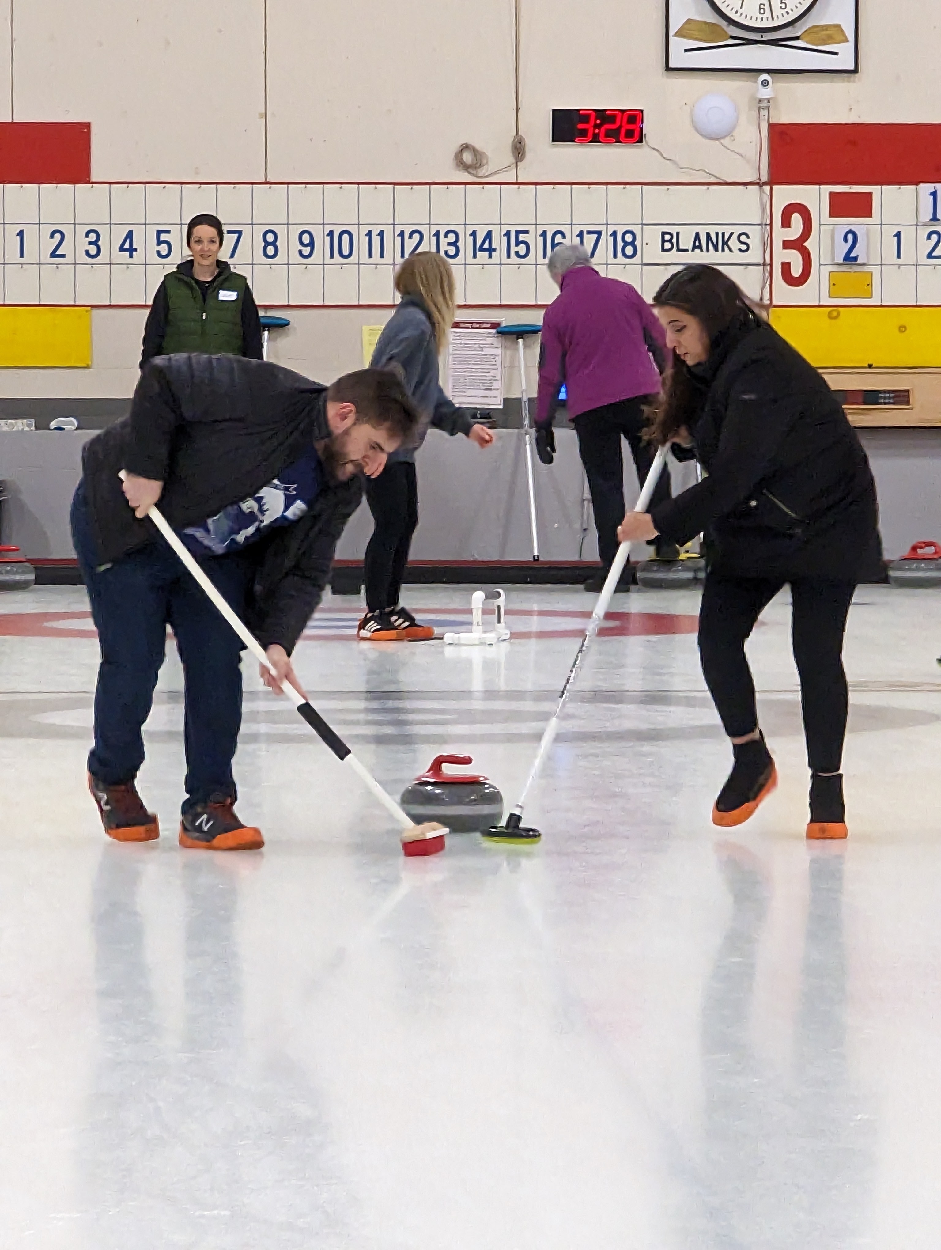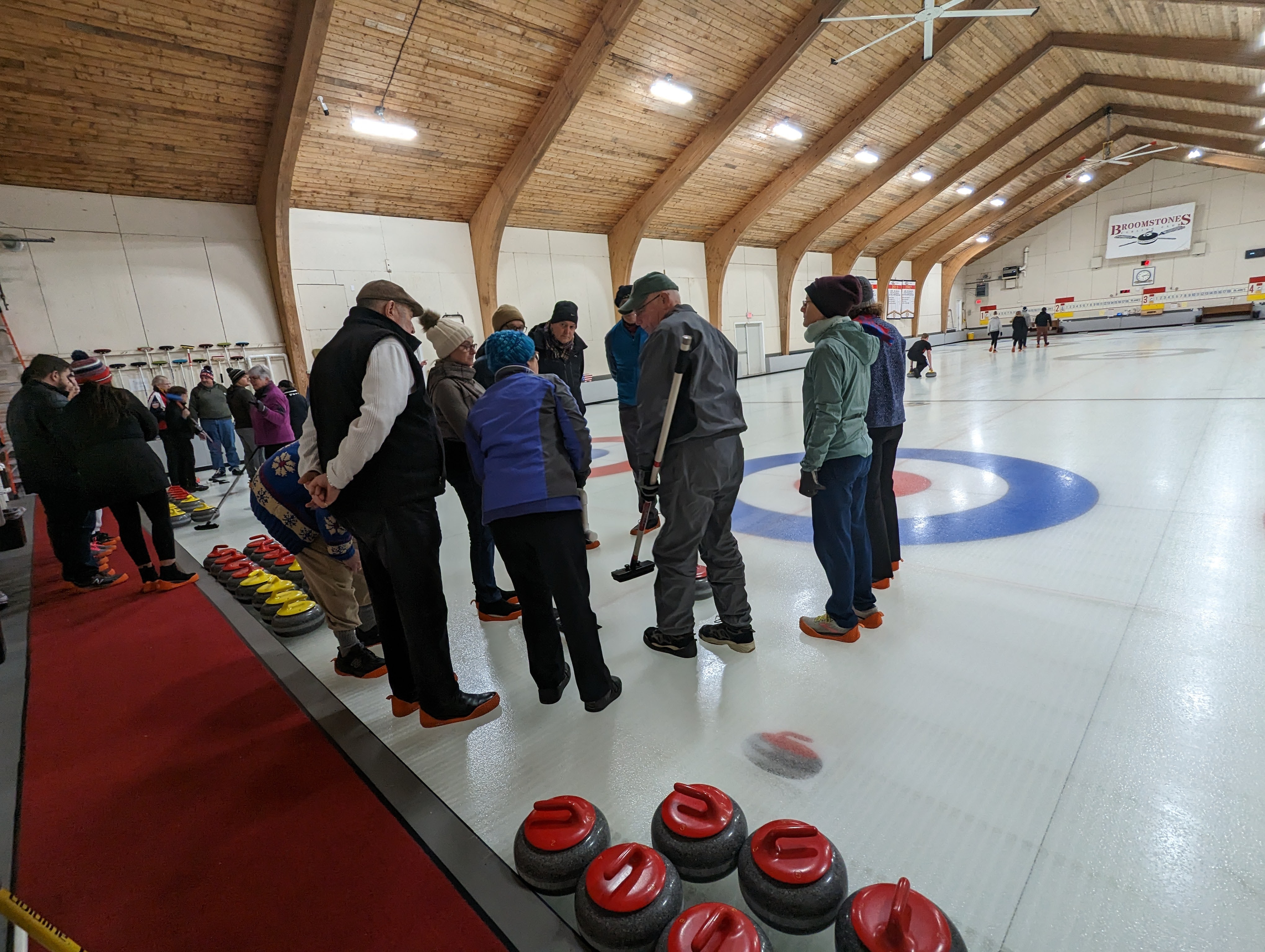 We started off with an informative safety briefing, then hit the ice to start learning the ropes of throwing, sweeping, and scoring. After a few practice rounds, each team played a brief game, then headed to the lounge for the traditional post-game drinks and banter. A great time was had by players and spectators alike. We look forward to hosting another curling event in the future! Good curling, everyone!