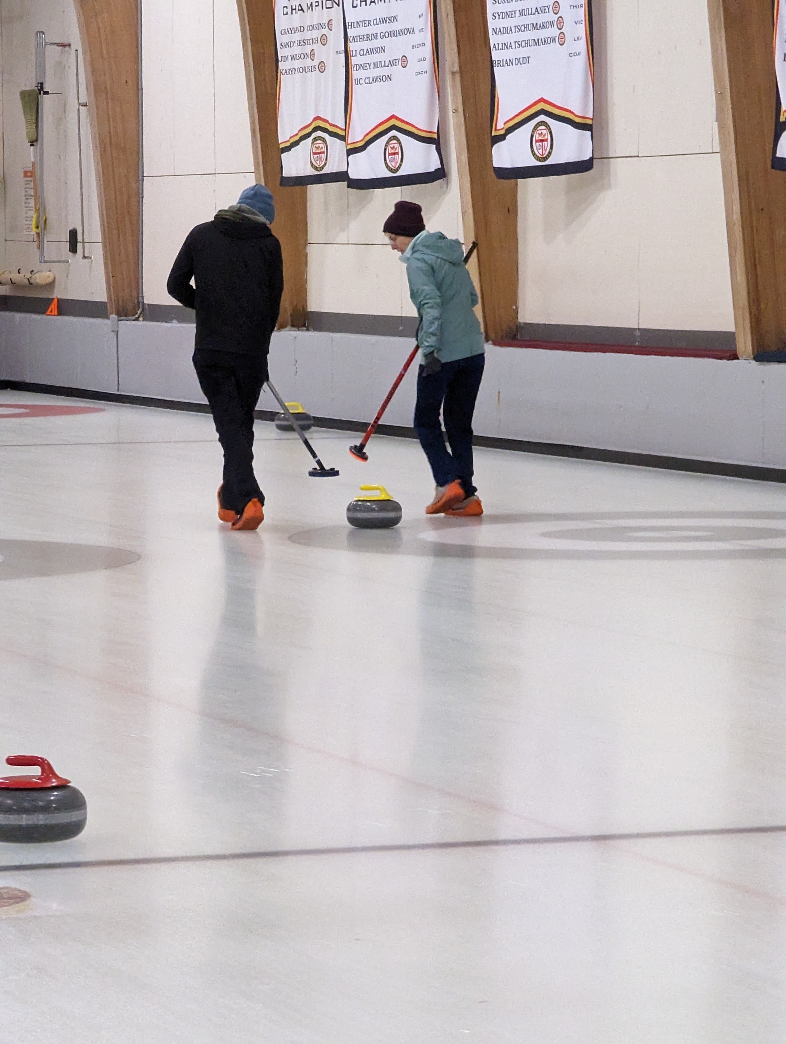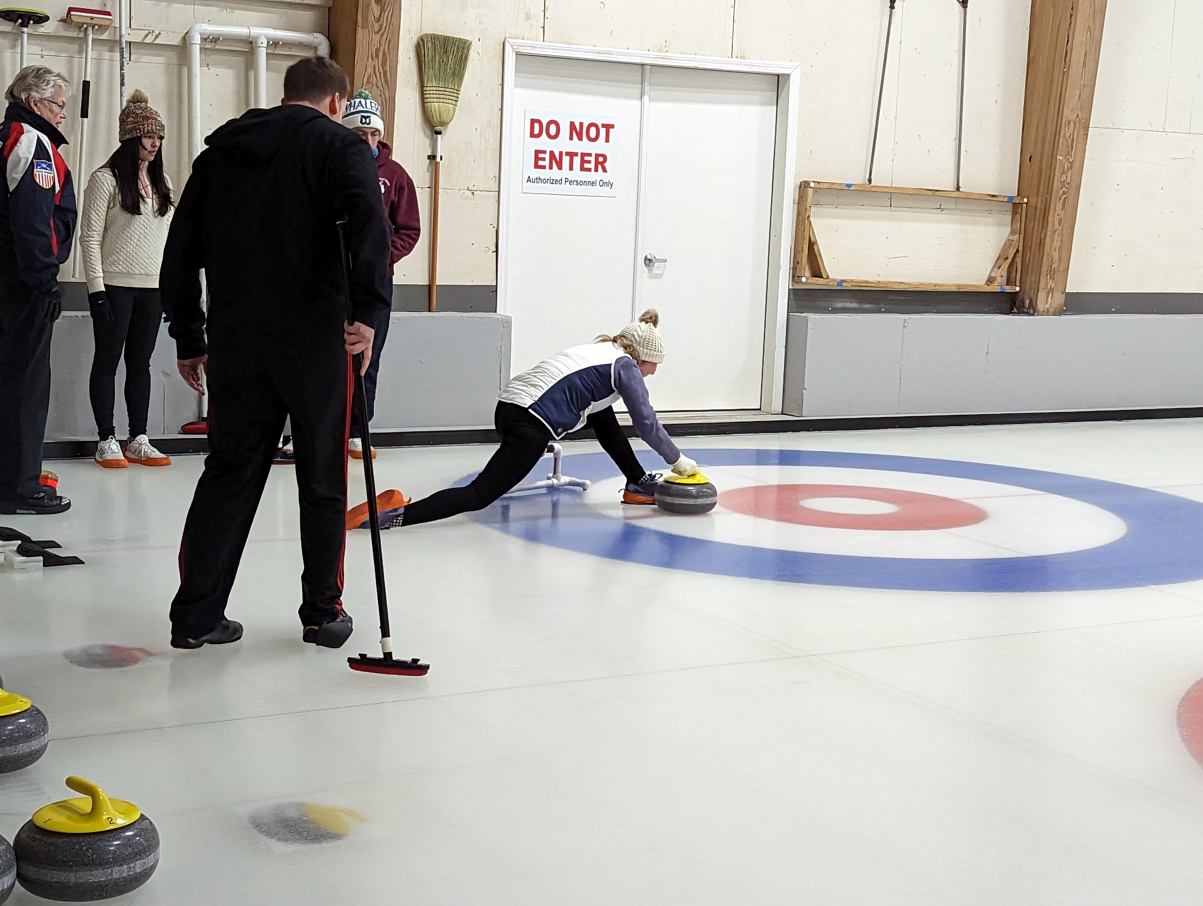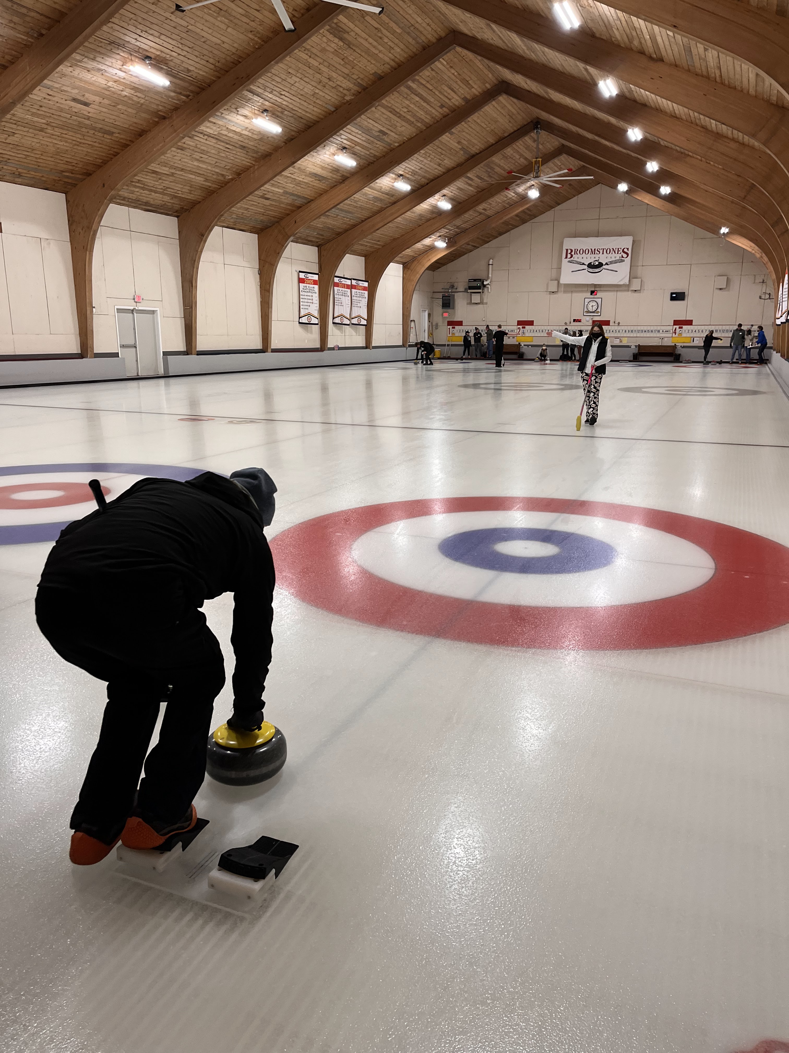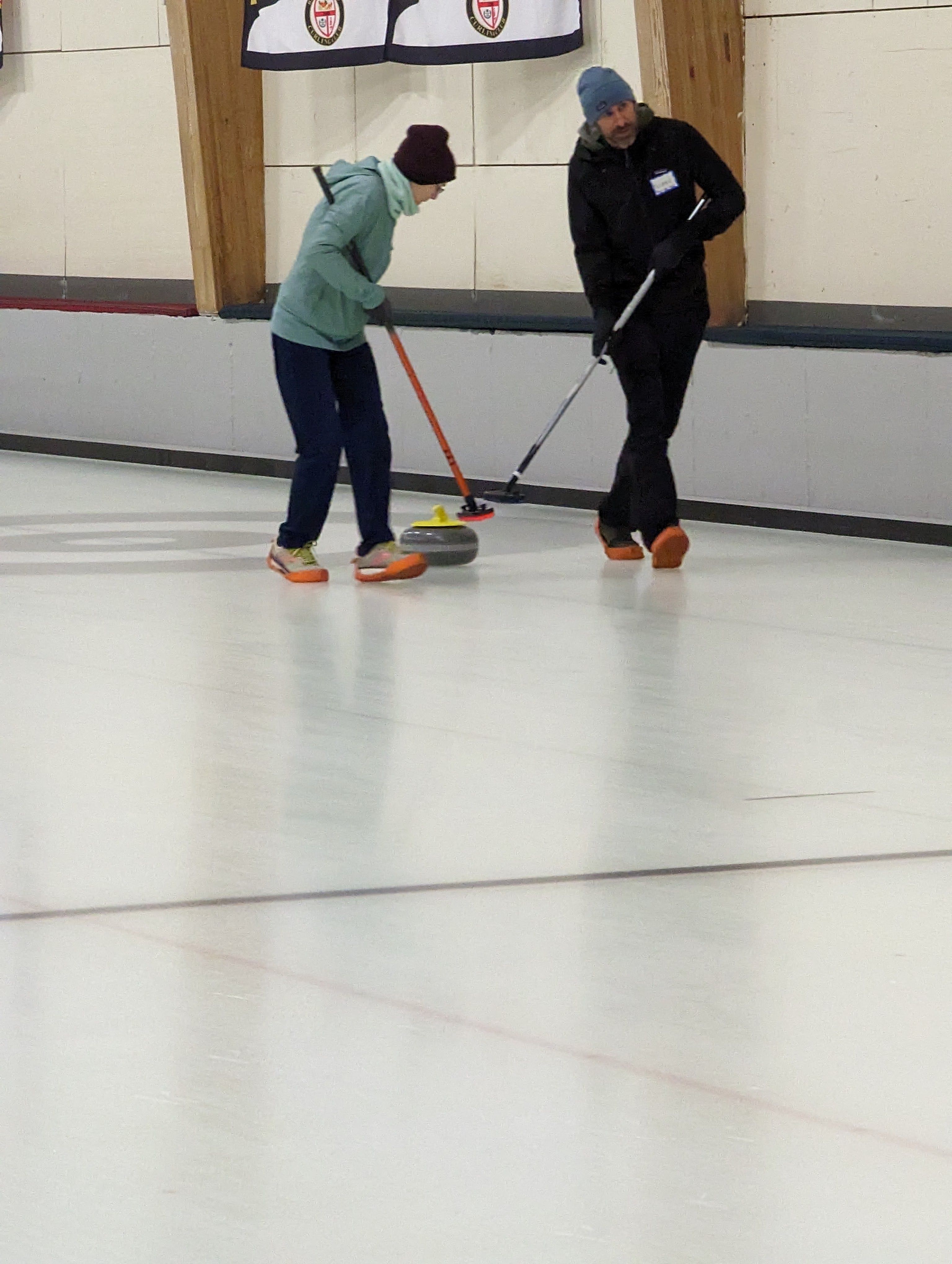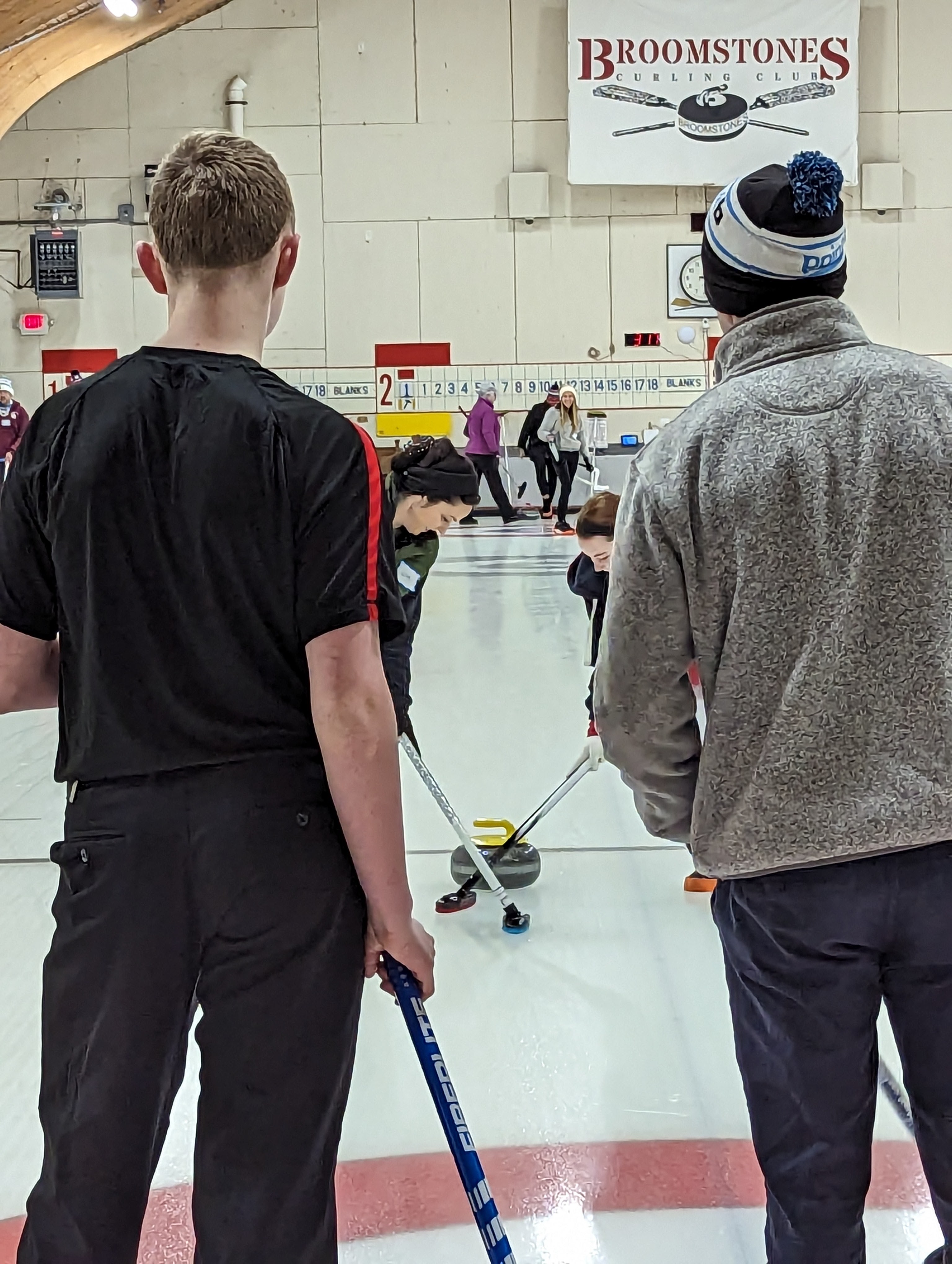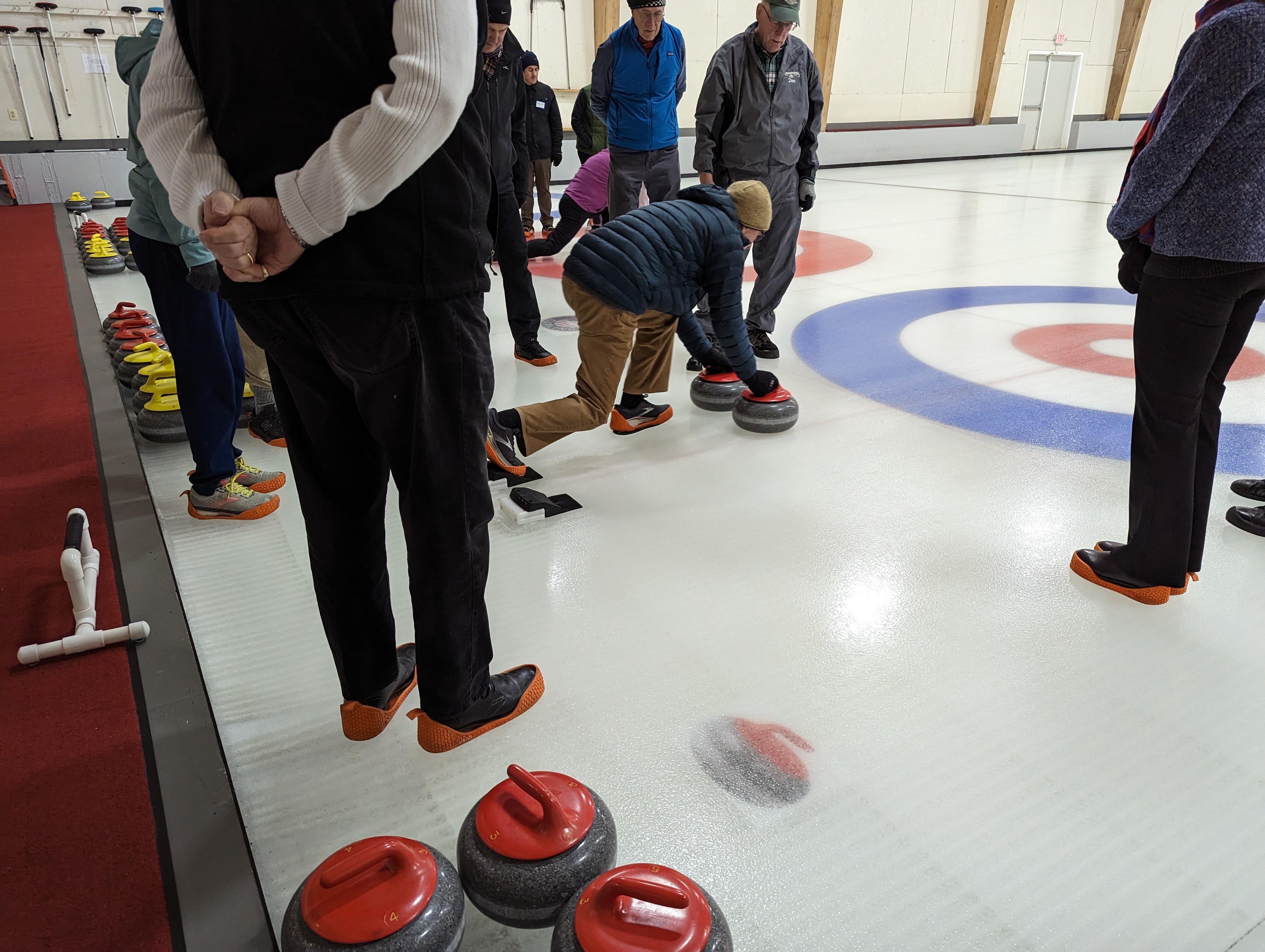 We started off with an informative safety briefing, then hit the ice to start learning the ropes of throwing, sweeping, and scoring. After a few practice rounds, each team played a brief game, then headed to the lounge for the traditional post-game drinks and banter. A great time was had by players and spectators alike. We look forward to hosting another curling event in the future! Good curling, everyone!