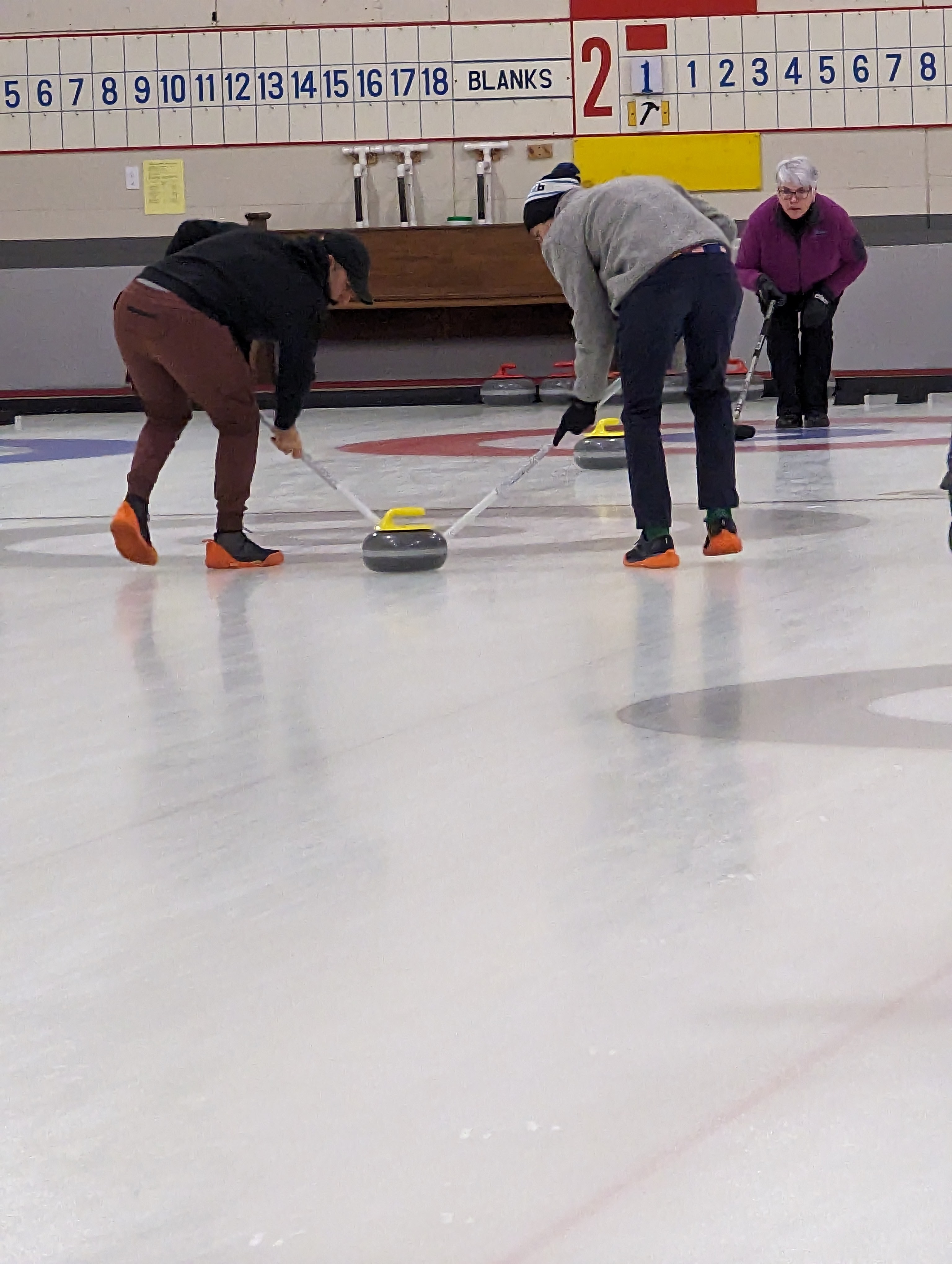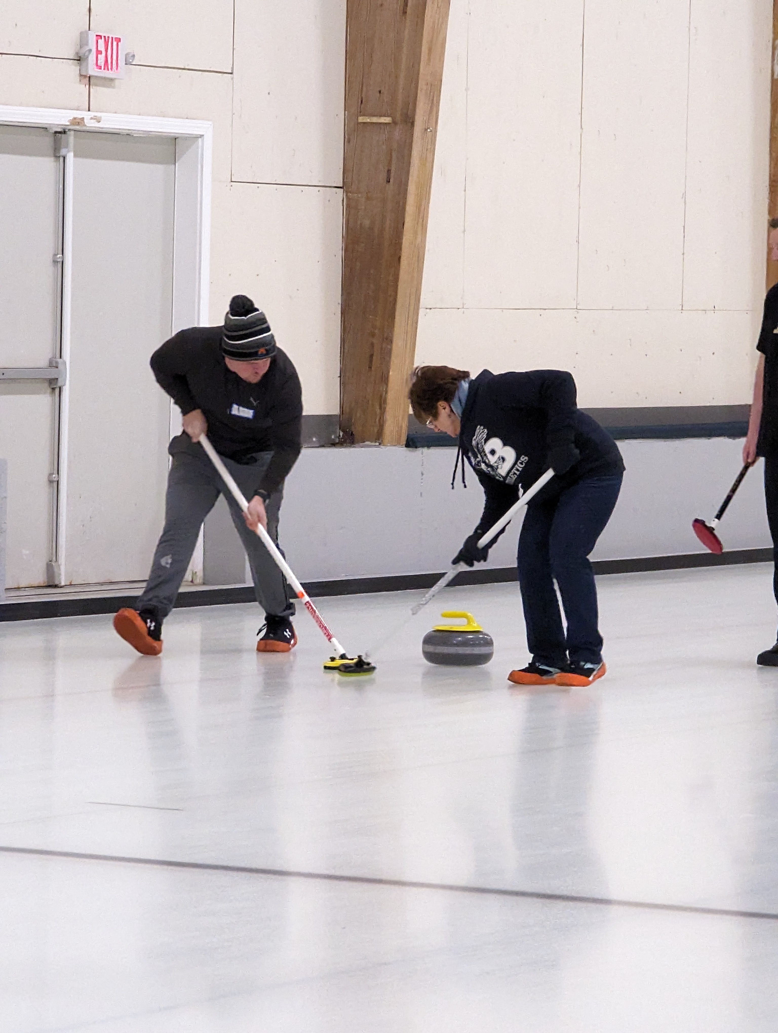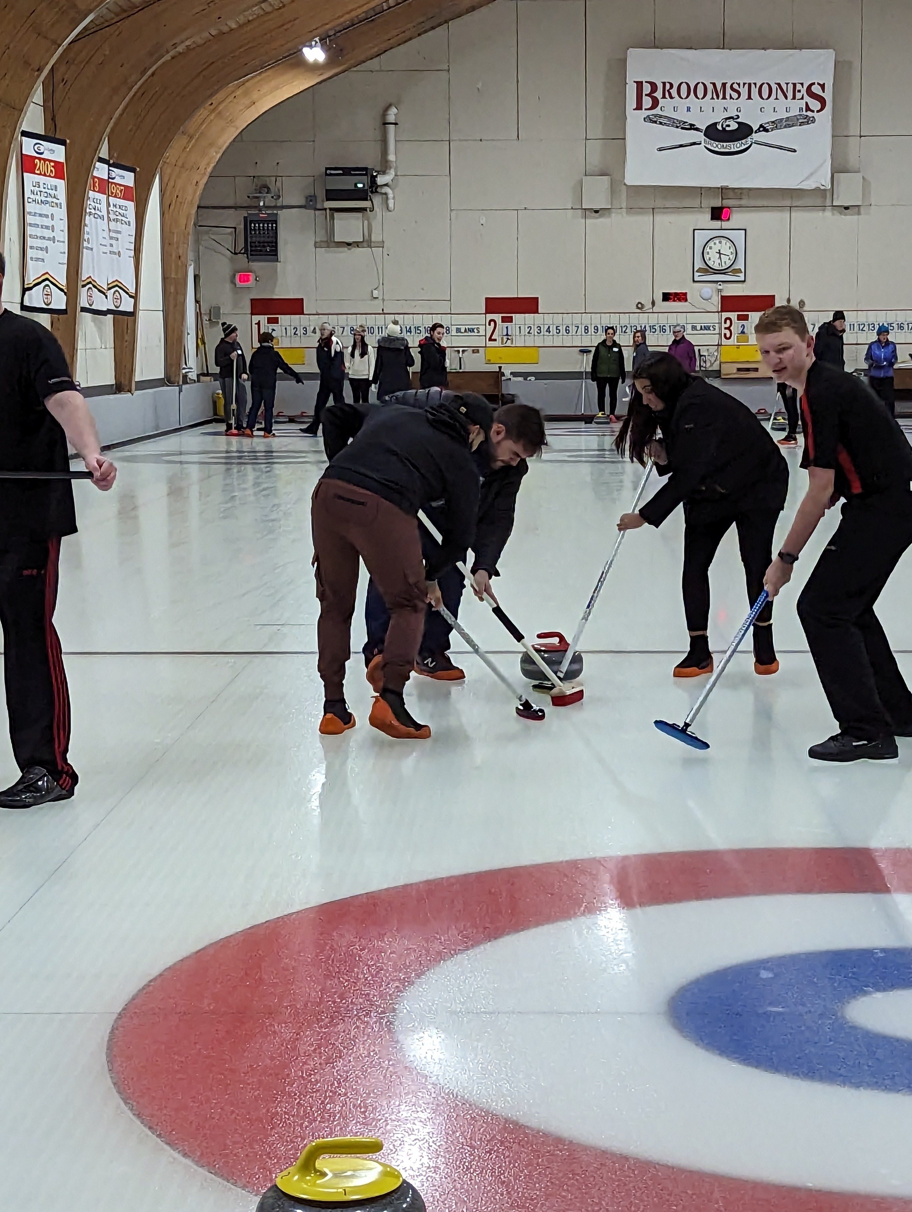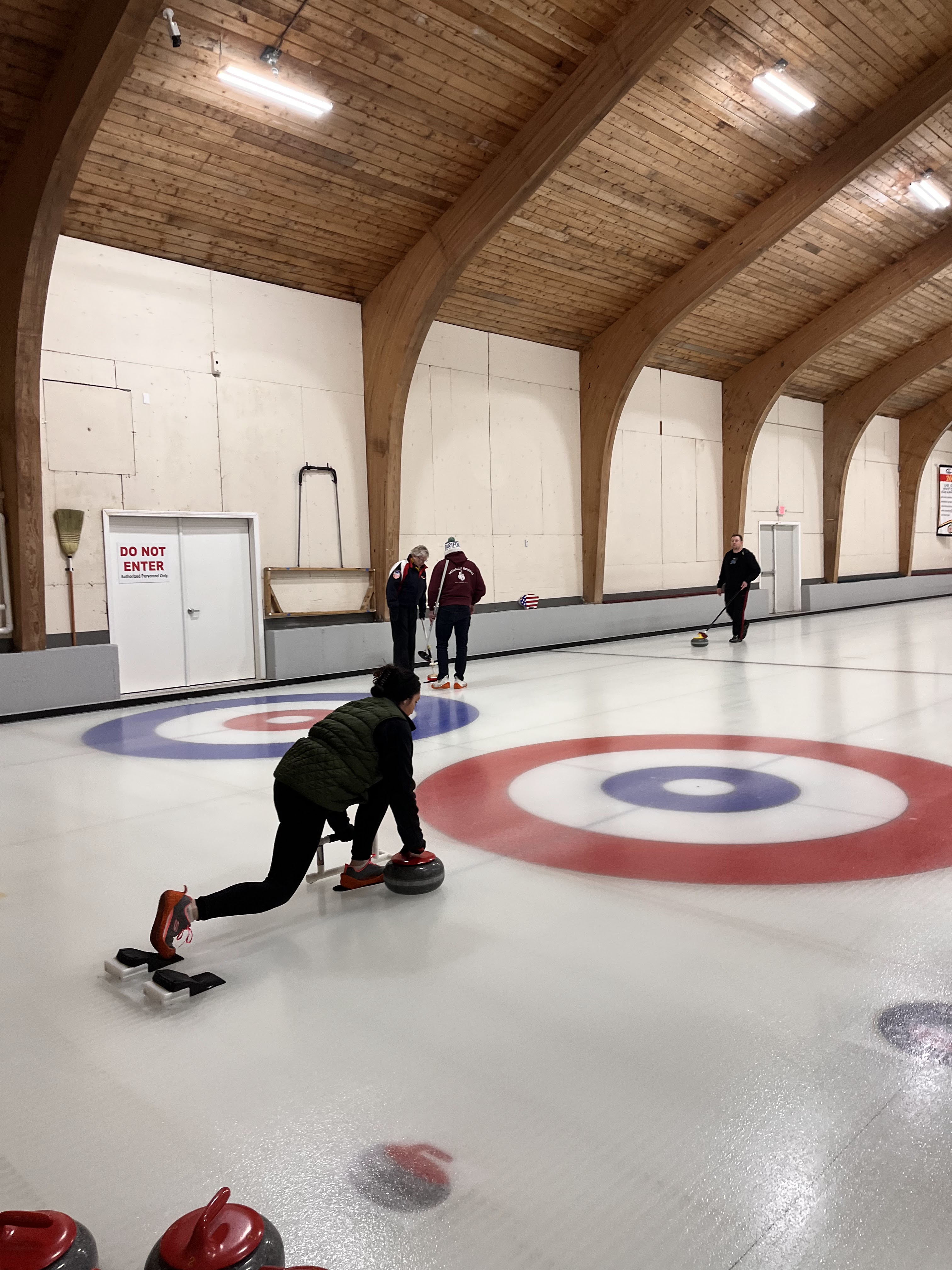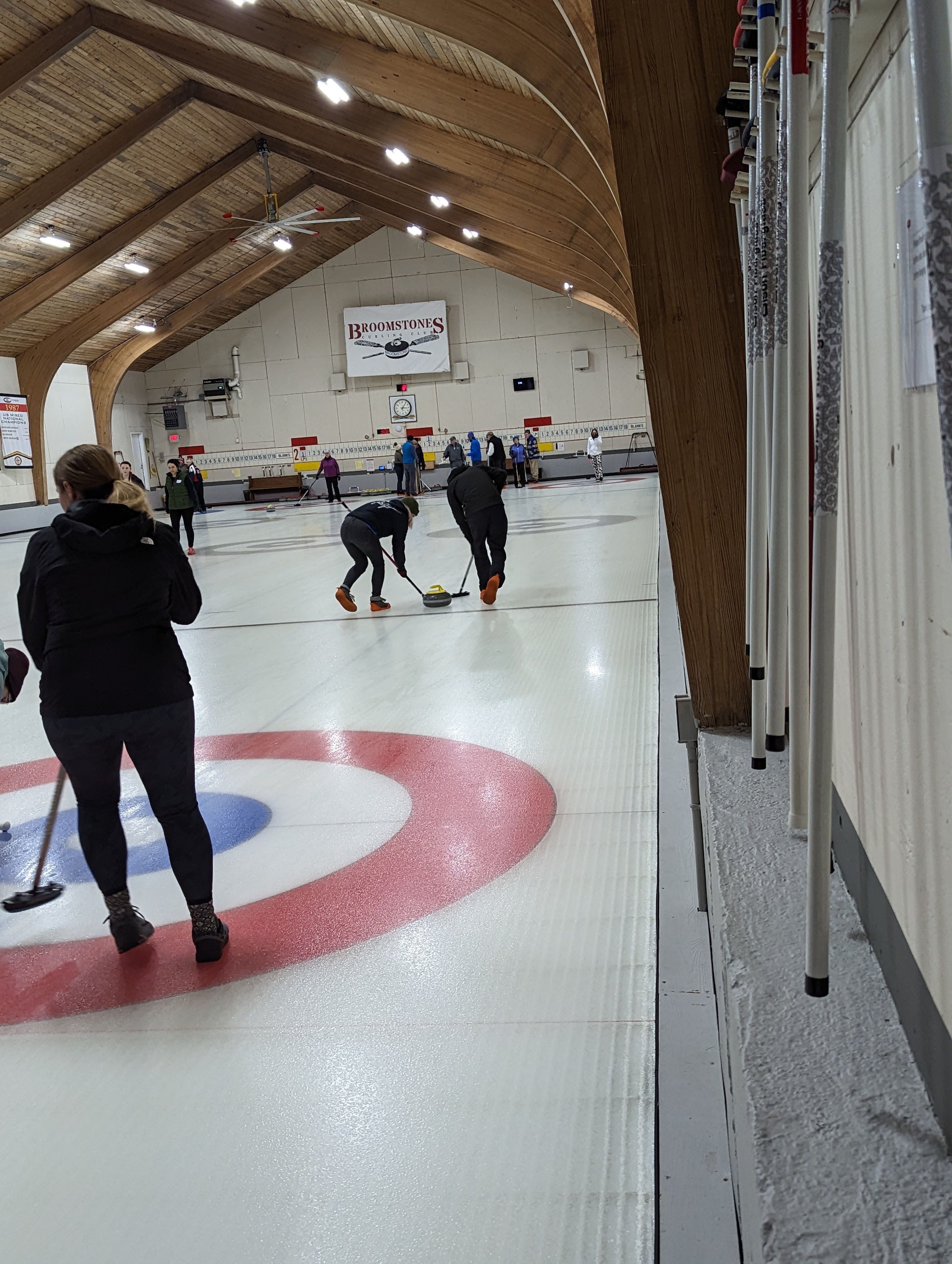 We started off with an informative safety briefing, then hit the ice to start learning the ropes of throwing, sweeping, and scoring. After a few practice rounds, each team played a brief game, then headed to the lounge for the traditional post-game drinks and banter. A great time was had by players and spectators alike. We look forward to hosting another curling event in the future! Good curling, everyone!