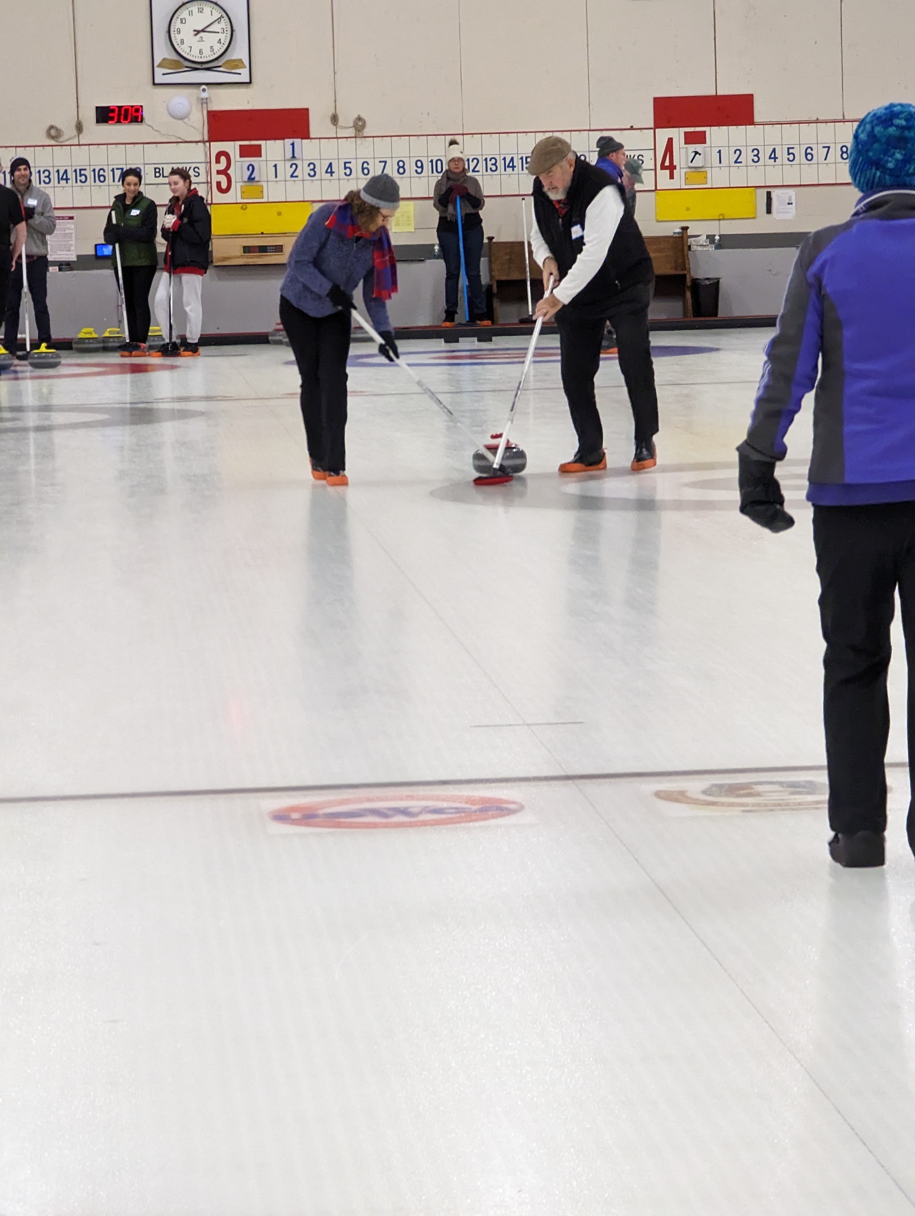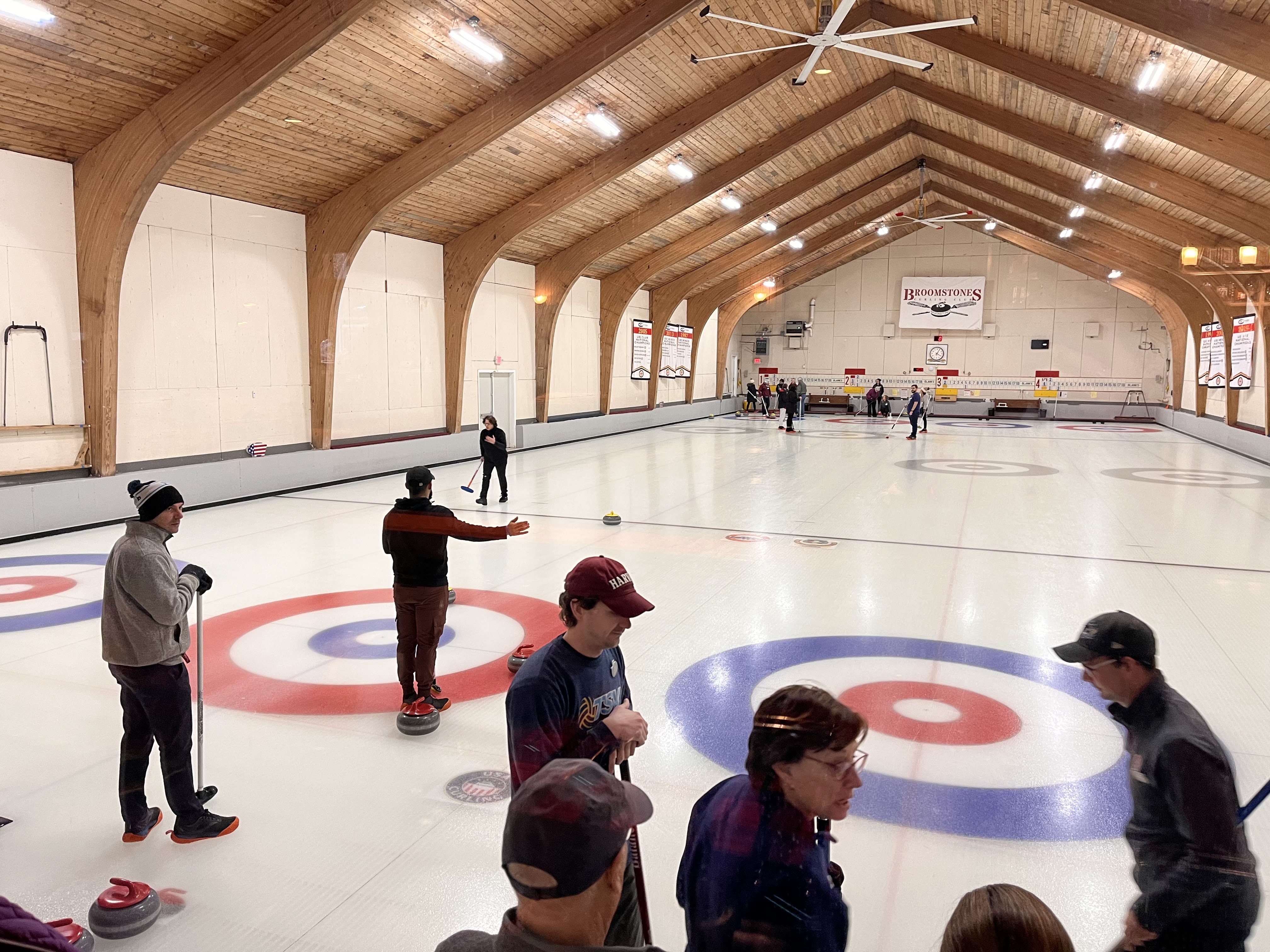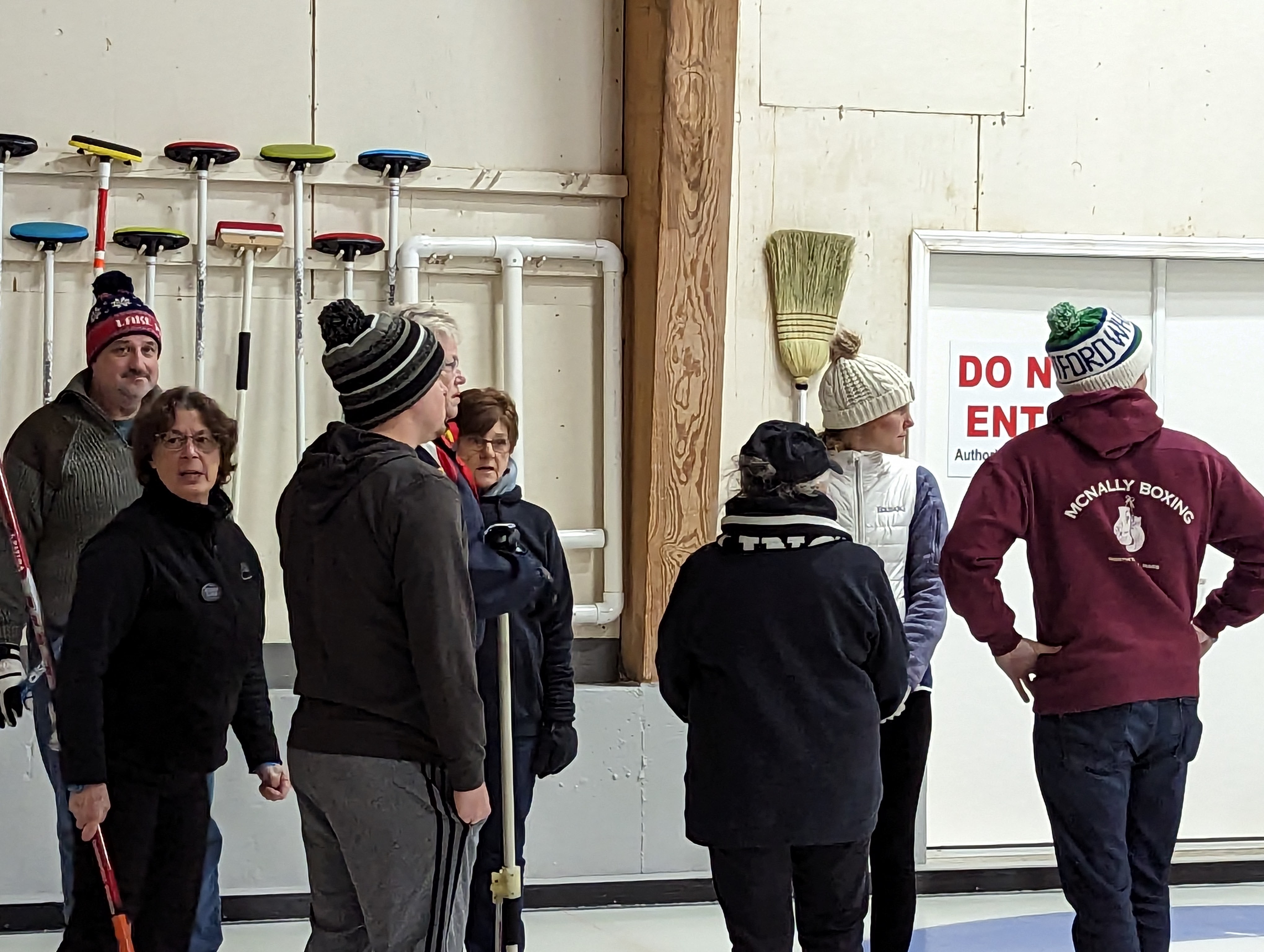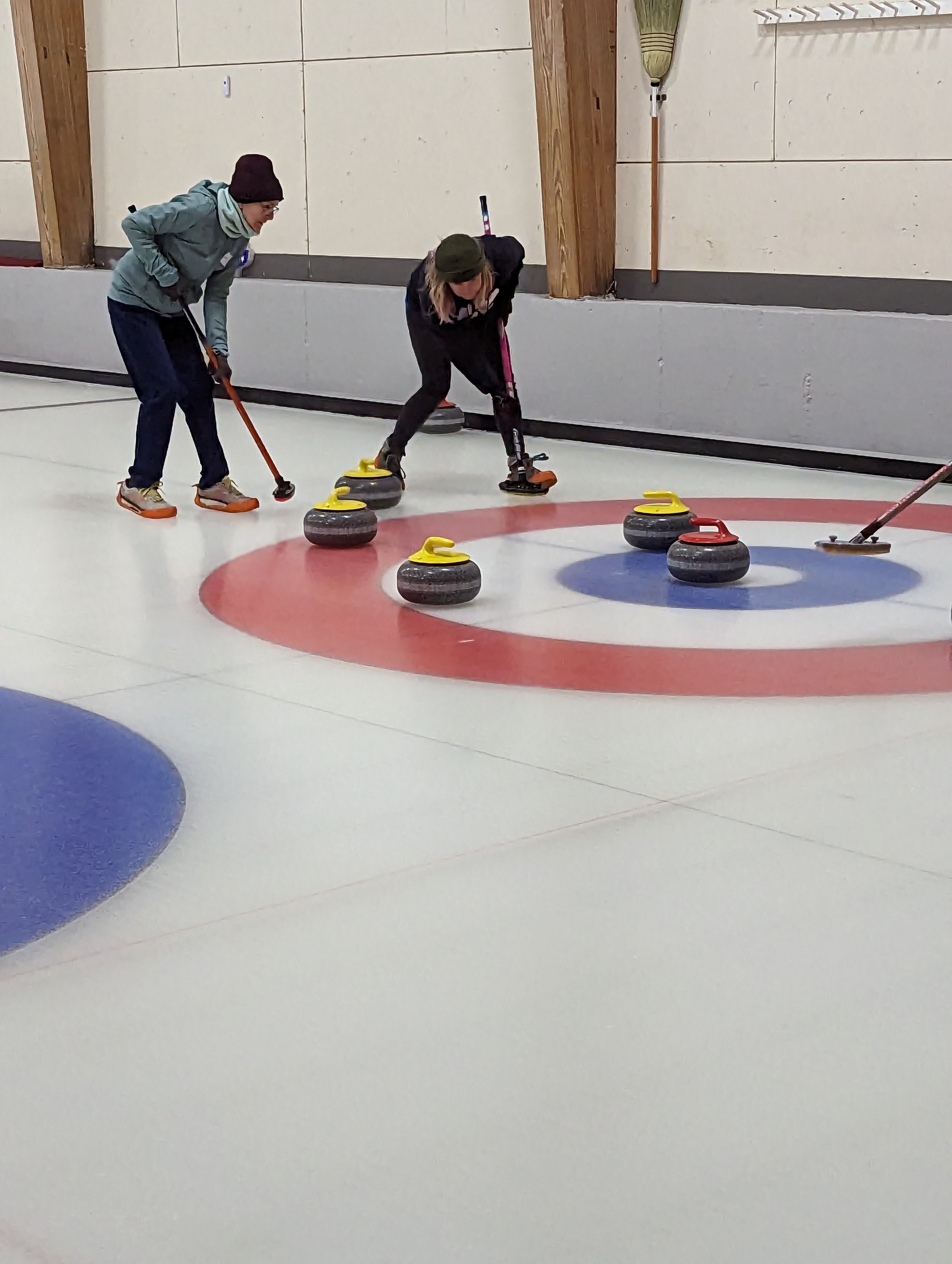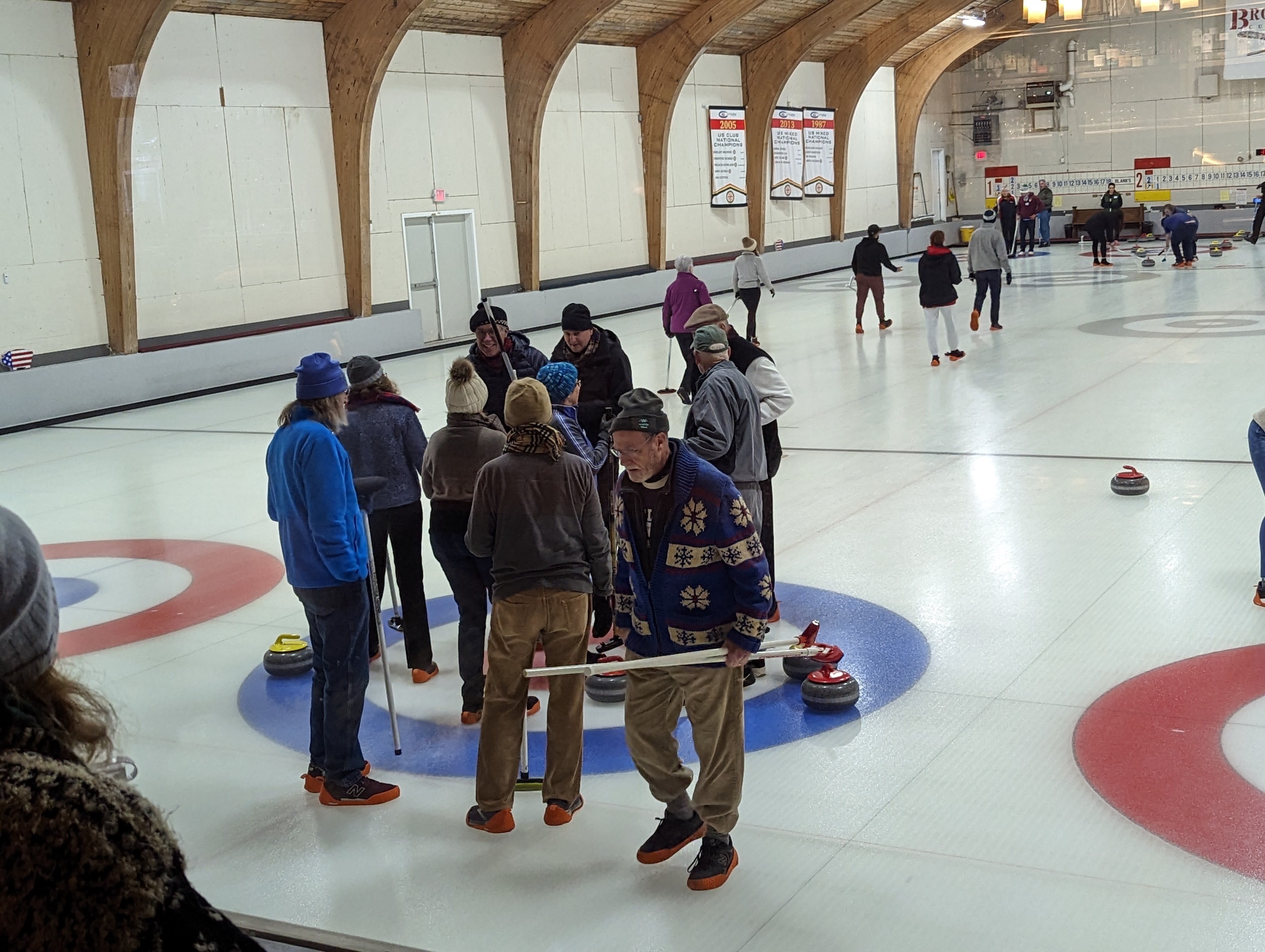 We started off with an informative safety briefing, then hit the ice to start learning the ropes of throwing, sweeping, and scoring. After a few practice rounds, each team played a brief game, then headed to the lounge for the traditional post-game drinks and banter. A great time was had by players and spectators alike. We look forward to hosting another curling event in the future! Good curling, everyone!
