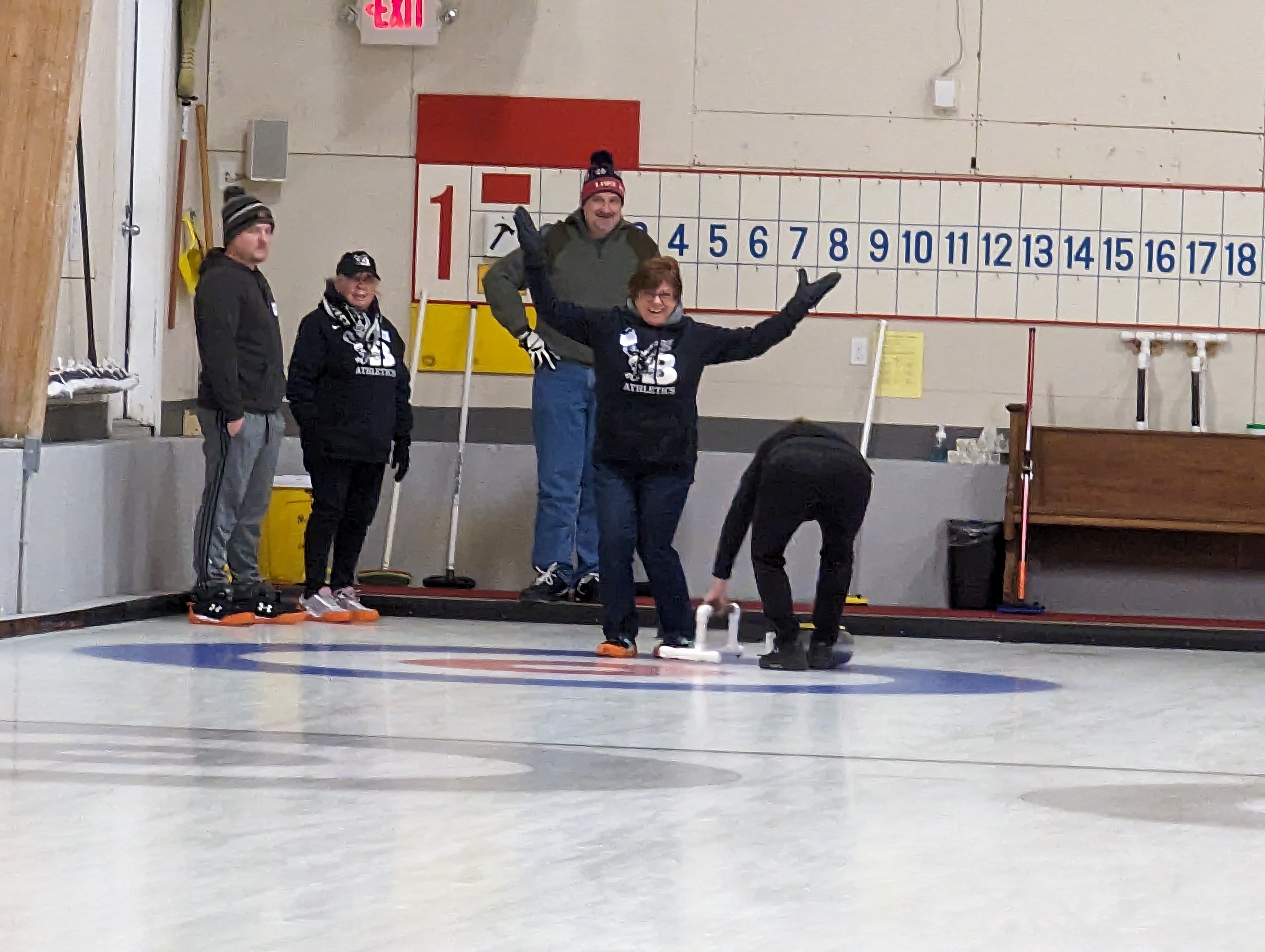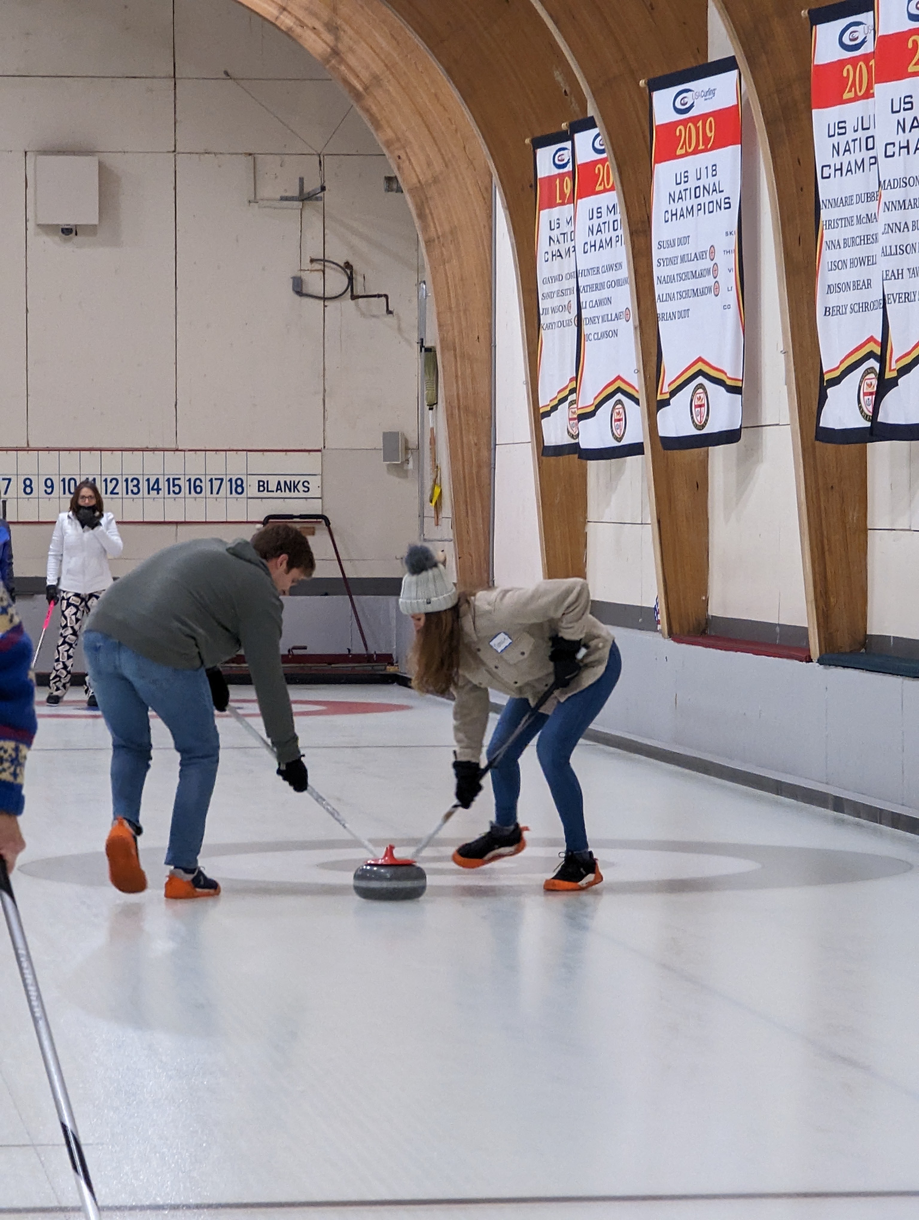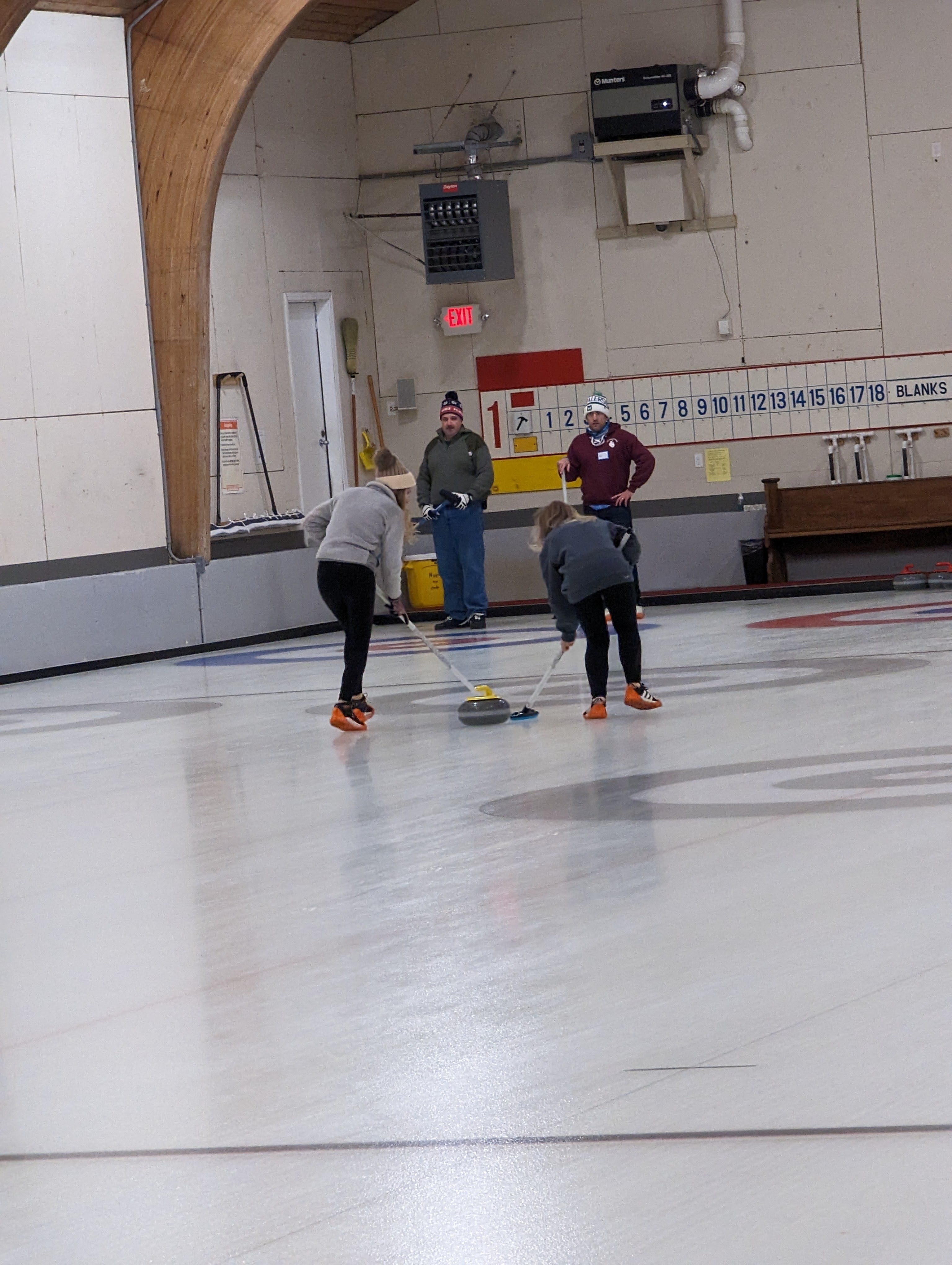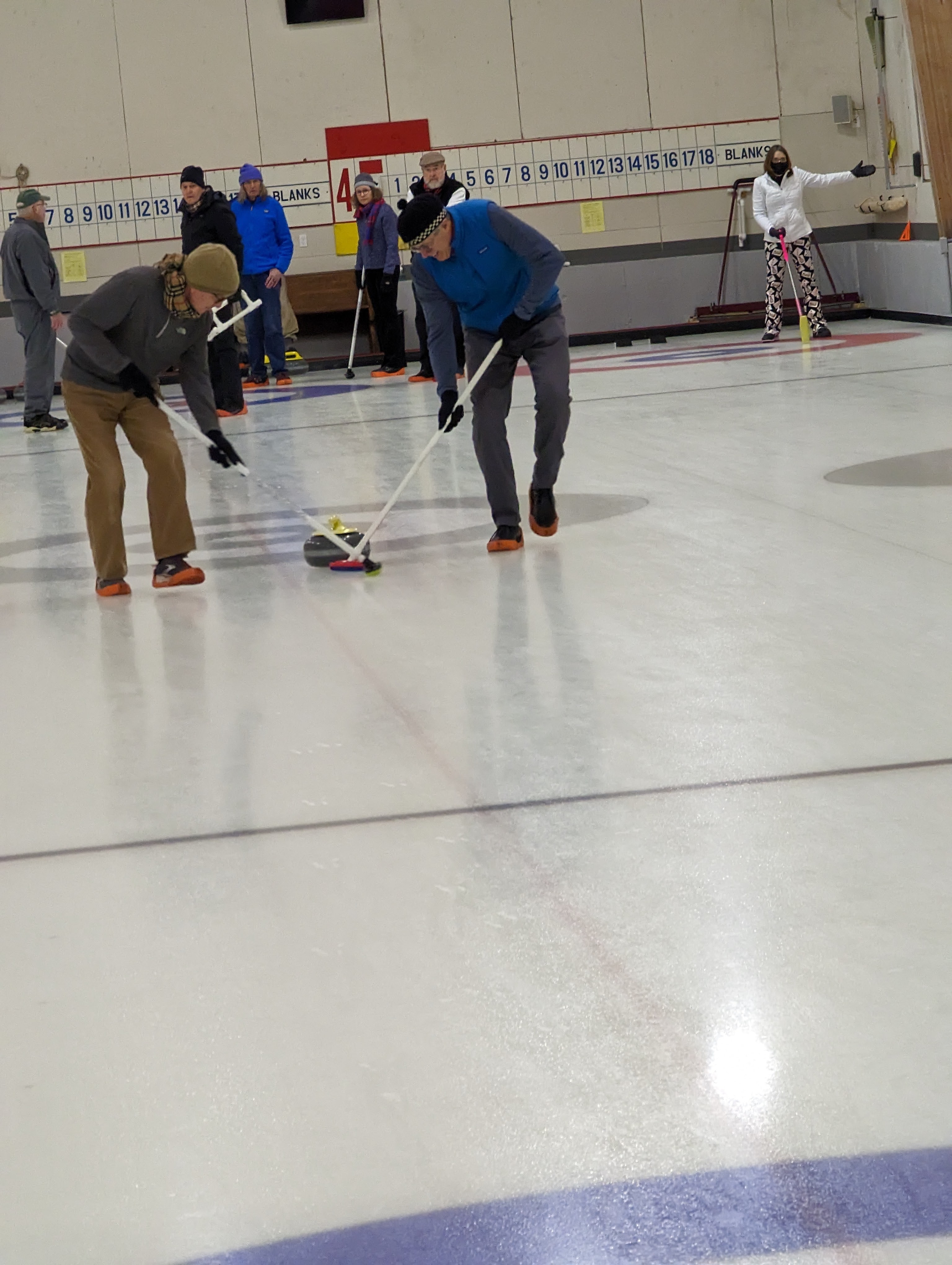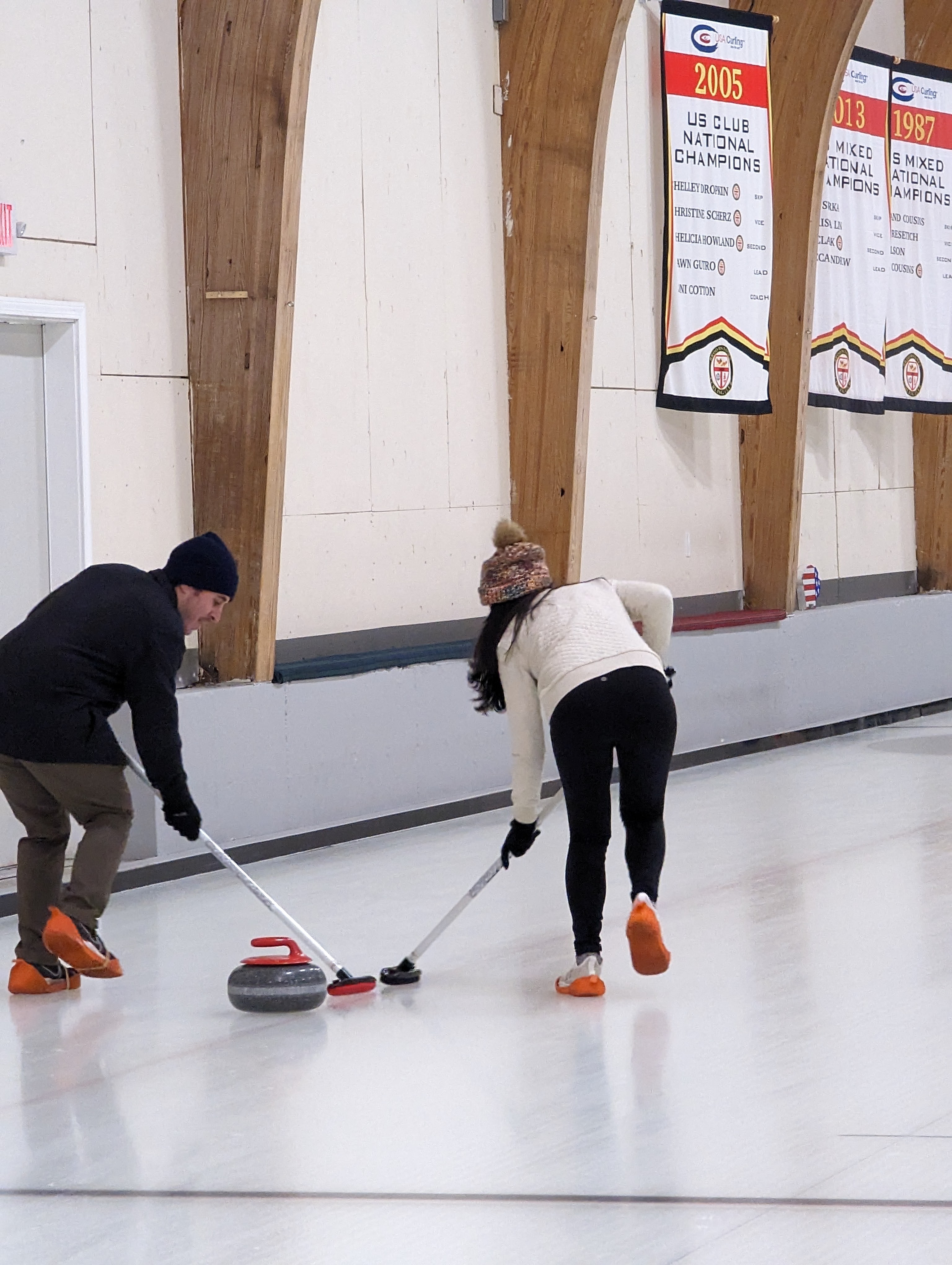 We started off with an informative safety briefing, then hit the ice to start learning the ropes of throwing, sweeping, and scoring. After a few practice rounds, each team played a brief game, then headed to the lounge for the traditional post-game drinks and banter. A great time was had by players and spectators alike. We look forward to hosting another curling event in the future! Good curling, everyone!