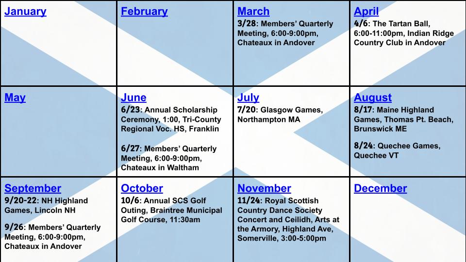 The SCS Annual January Meeting will take place on JANUARY 19, 2023 Join us at The Chateau Restaurant, 195 School Street, Waltham, Mass., from 6:30 pm to 8:30 pm, and hear from our guest speaker, Linda McJannet, President of the Royal Scottish Country Dance Society. Linda is also a Professor of English and Media Studies…