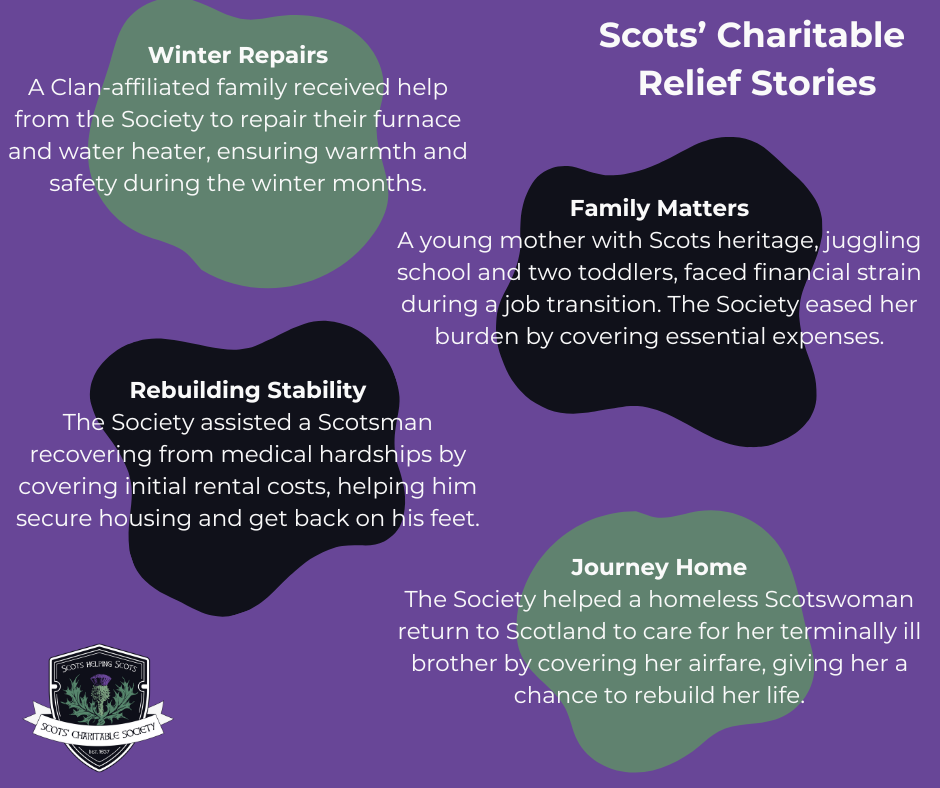 We appreciate that everyone needs a helping hand from time to time and Scots’ Charitable want to make sure that a ‘hand’ is offered to the Scottish-American community. Therefore, the organization has resources and funds in place to offer relief and aid where applicable. You do not have to be a member to request relief – as long as you are of Scottish descent you can apply. Please do not hesitate to get in touch to find out more information – all inquiries stay confidential.