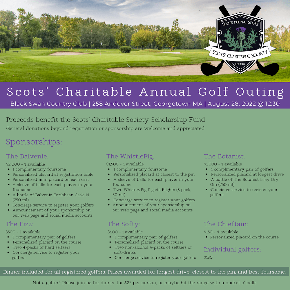 The Scots’ Charitable Annual Golf Outing RETURNS on August 29th at Campbell’s Scottish Highlands Golf Course in Salem, New Hampshire. Tee off at 11:30 am.